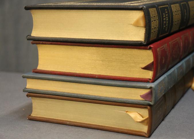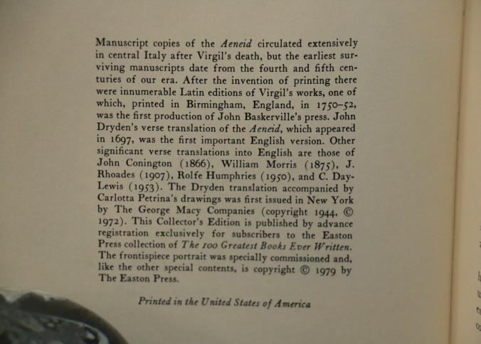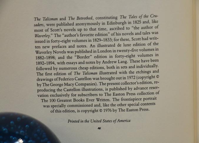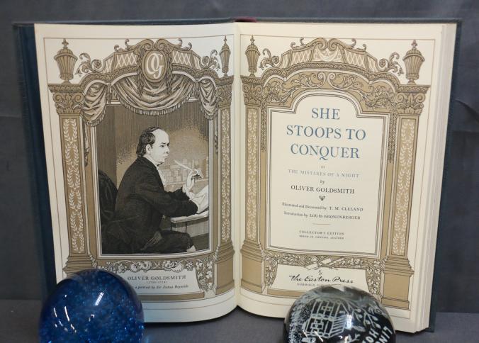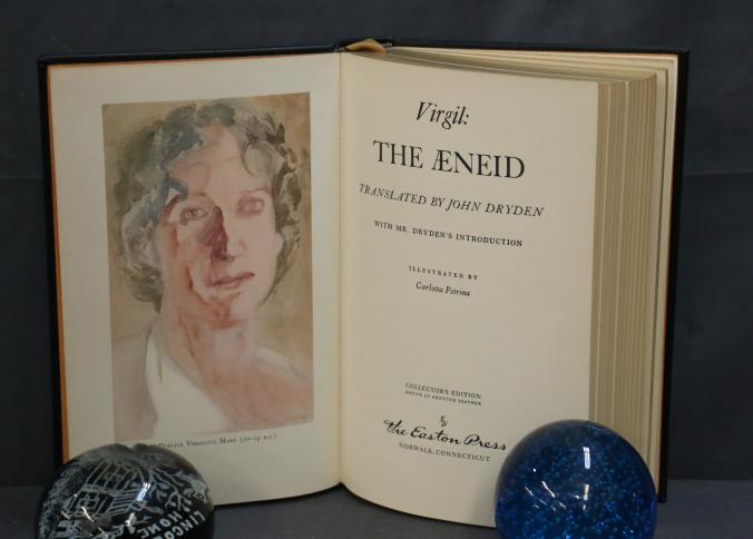 Easton Press Collector's Editions of Four Classic Literary Works. Includes 'The Talisman' by Sir Walter Scott, 'She Stoops to Conquer' by Oliver Goldsmith, 'The Red and the Black' by Stendhal, and 'The Aeneid' by Virgil. Bound in genuine leather with gold leaf spines and edges, each volume features illustrations and introductions by notable contributors. Copyright 1976, 1978, 1979, and 1980 by The Easton Press.