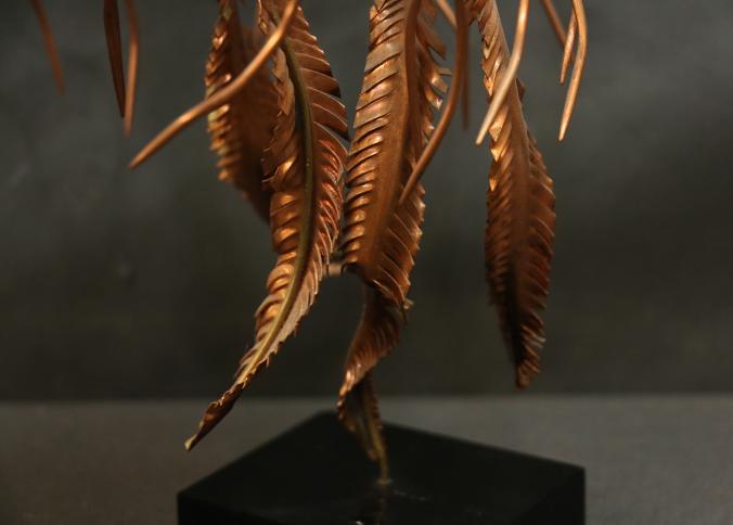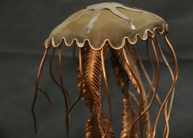 John Stark Metal Sculpture Depicting a Jellyfish. Crafted from metal with intricate copper and brass details for the jellyfish body and tentacles. Mounted on a black base with a visible chip on the base's corner. Pickup only.