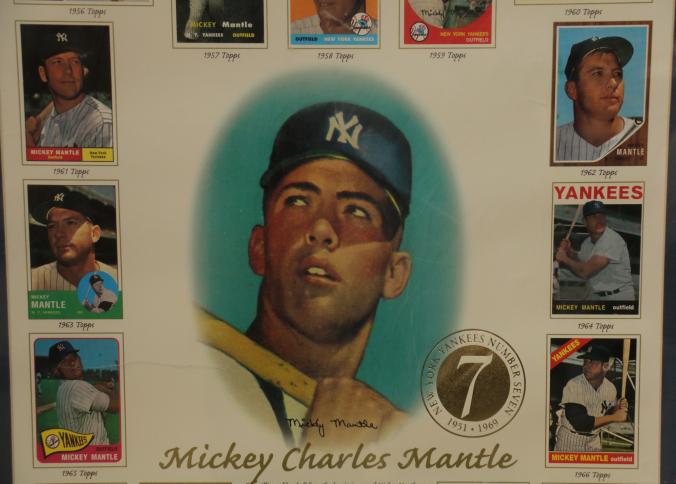 Framed Mickey Mantle Tribute with Limited Edition Number includes artwork commemorating the legendary baseball player. The piece showcases a combination of images and statistics celebrating his career, with multiple Topps and Bowman card reproductions. Edition number 4673/10,000. Pickup only.