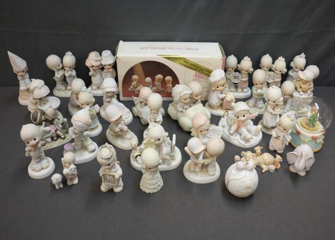 Over 30 Precious Moments figurines, including a nativity scene and various decorative figurines such as 'You Are Always On My Mind,' 'We Knead You Grandma,' 'Wishing You Roads of Happiness,' and others. Includes boxed 'Come Let Us Adore Him' nativity set. Comes with some original boxes and empty boxes. See photos for damages. Pickup only.