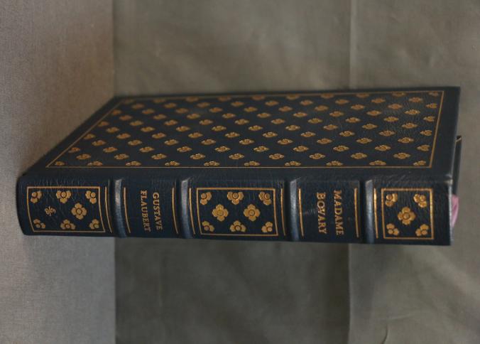 Madame Bovary by Gustave Flaubert, Easton Press Collector's Edition, bound in dark leather with gold leaf decoration and lettering on the cover and spine. Features gold leaf-edged pages, satin ribbon marker, and wood engravings by Theo Schmied. Includes an introduction by Jacques de Lacretelle, translated by J. Lewis May. Copyright 1978 by The Easton Press.