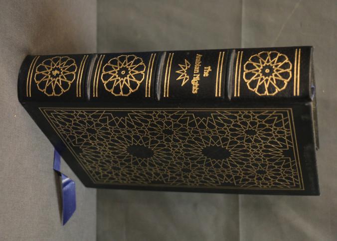 The Arabian Nights Entertainments Leather-Bound Easton Press Edition. Translated by Sir Richard Burton with notes by Henry Torrens, Edward Lane, and John Payne and illustrations by Arthur Szyk. This collector's edition is bound in genuine leather with intricate gold-tone embossed designs on the cover and spine. Includes gold leaf page edges and a satin bookmark ribbon. Copyright 1981 by The Easton Press.