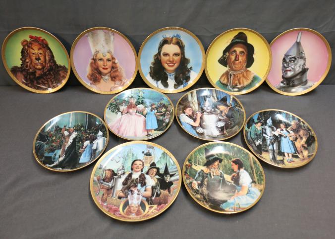 The Wizard of Oz Decorative Plate Set Featuring Iconic Scenes and Characters. Includes character portraits such as Dorothy, Glinda, the Scarecrow, Cowardly Lion, Tin Man, and additional plated scenes from the classic film. Each plate is part of The Hamilton Collection, limited to 14,000 firing days. Plates highlight vivid illustrations and gold-tone trim accents. Pickup only.