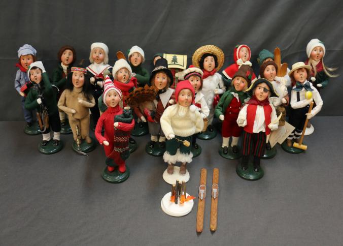 Holiday-Themed Figurines Featuring Carolers and Accessories. Includes approximately 20 hand-crafted figurines dressed in winter and holiday attire, each posed uniquely with props such as skis, lanterns, musical instruments, and winter-themed accessories. Pickup only.