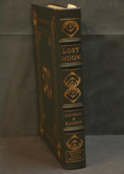 Signed First Edition 'Lost Moon' by Lovell and Kluger. Leather-bound book featuring gold leaf accents, a ribbon marker, and gold leaf page edges. Includes illustrations and the iconic Apollo XIII emblem. Personally signed by James Lovell and Jeffrey Kluger. Published by The Easton Press with permission from Houghton Mifflin Company and copyrighted 1989.
