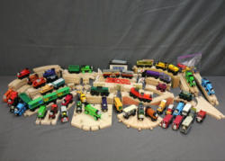 Thomas Wooden Railway Engines, Cars, and Tracks, featuring an assortment of trains, rolling stock, wooden tracks, bridges, and accessories. Includes multiple painted wooden engines and cars with facial decals, curved and straight track pieces, bridges, and structures. Pickup only.
