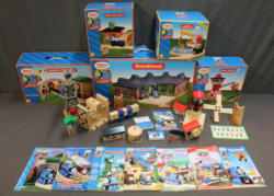 Thomas Wooden Railway Buildings, Accessories, and Yearbooks includes various boxed playsets, such as the Roundhouse, Conductor's Figure 8 Set, Sodor Dairy Farm, Sodor Airfield, and Brendam Fishing Dock. Additional wooden railway segments, structures, and accessories included alongside a selection of Thomas Wooden Railway Yearbooks. Pickup only.