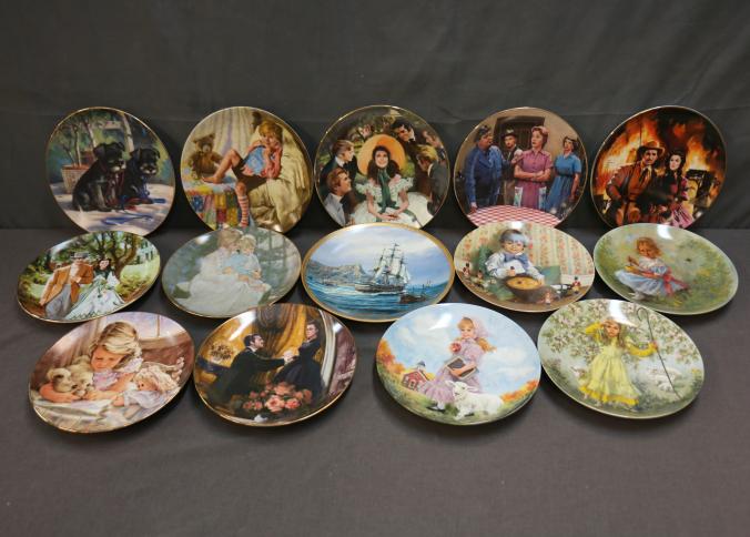 14 decorative collector plates featuring various scenes from literature, art, and historical themes. Plates include works from The Hamilton Collection, Reco, and similar makers, with titles such as 'Scarlett and Rhett Butler,' 'The Honeymooners,' 'U.S.S Constitution,' 'Little Bo Peep,' and more. Pickup only.