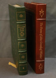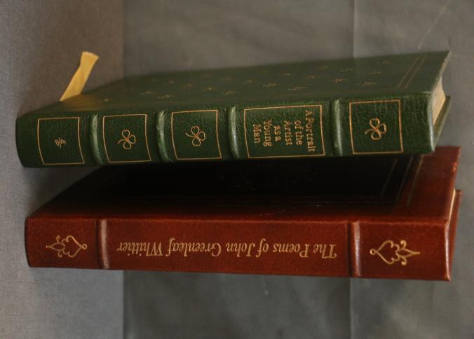 Easton Press leather-bound editions of 'A Portrait of the Artist as a Young Man' by James Joyce, with illustrations by Brian Keogh, and 'The Poems of John Greenleaf Whittier,' selected and edited by Louis Untermeyer with illustrations by R.J. Holden. Both books feature gold leaf decorations, gold leaf edges, and ribbon bookmarks. Copyright 1973 and 1977 by The Easton Press.
