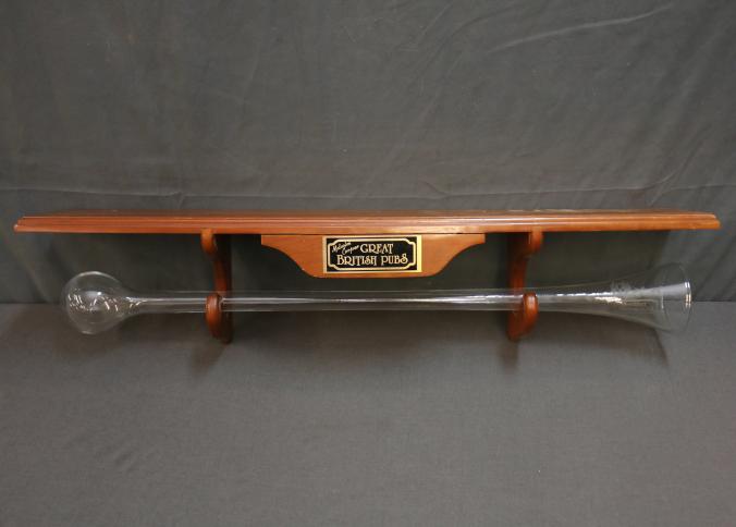 Malcolm Cooper Great British Pubs Yard of Ale Glass With Wooden Wall Mount. Featuring a clear yard of ale glass etched with a classic stagecoach motif and the brand name, the piece is displayed on a wooden mount with a brass plaque. Distinct wooden brackets support the glass, designed for wall installation. Pickup only.
