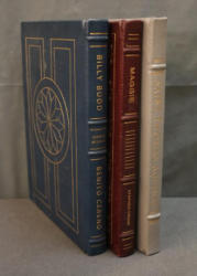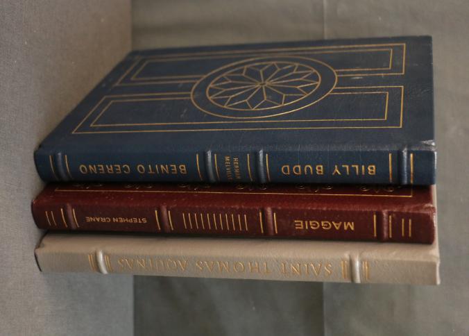 Easton Press Leather-Bound Book Set: Saint Thomas Aquinas, Billy Budd and Benito Cereno, Maggie. This set features three leather-bound editions with gold leaf-edged pages, decorative covers, and illustrations throughout. Each book is part of collector's editions published by The Easton Press with copyright dates ranging from 1965 to 1985.