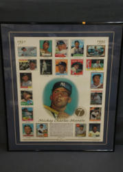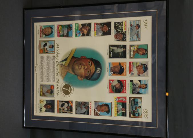 Framed Mickey Mantle Tribute with Limited Edition Number includes artwork commemorating the legendary baseball player. The piece showcases a combination of images and statistics celebrating his career, with multiple Topps and Bowman card reproductions. Edition number 4673/10,000. Pickup only.