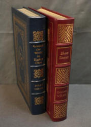 The Short Stories of Oscar Wilde and Around the World in Eighty Days by Easton Press are leather-bound collector's editions with gold leaf page edges and extensive illustrations. The Oscar Wilde volume features illustrations by James Hill, while the Jules Verne volume includes artwork by Edward A. Wilson. Copyright 1976 and 1983 by The Easton Press.