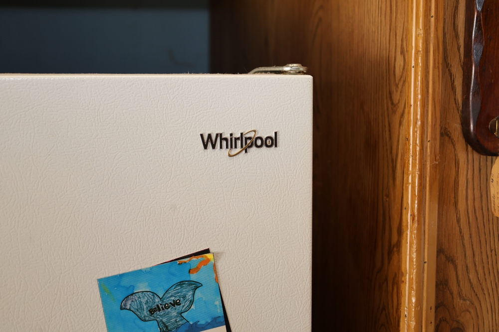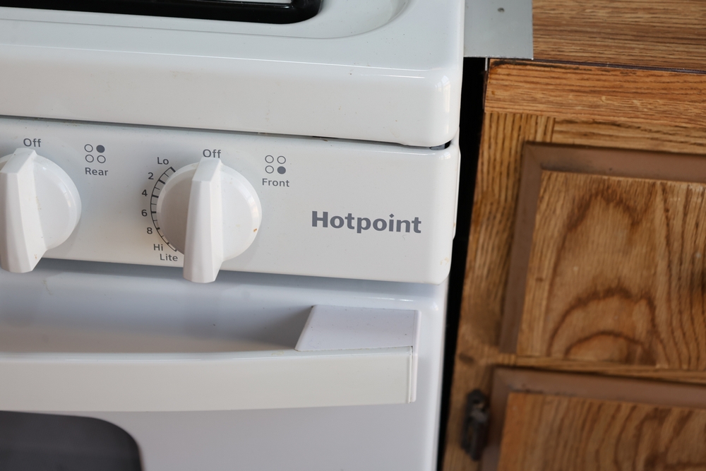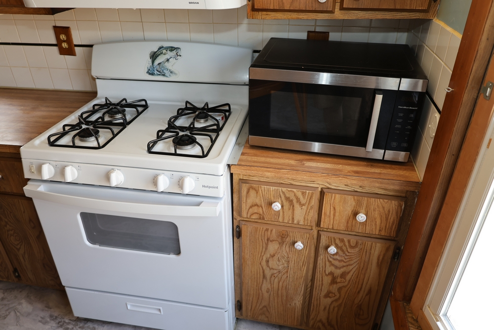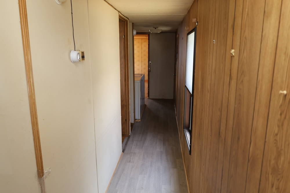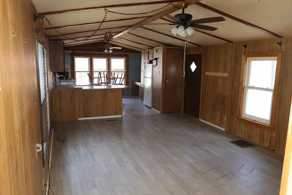 Inside features multiple rooms including bedrooms and one bathroom, vinyl plank-style flooring in the visible areas, wood-paneled walls, and multiple windows. The kitchen contains wood cabinets, laminate-style countertops, and a double-basin sink. Also present are a free-standing Hotpoint gas range, a Whirlpool refrigerator/freezer, a microwave, and a range hood.