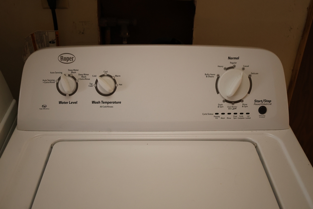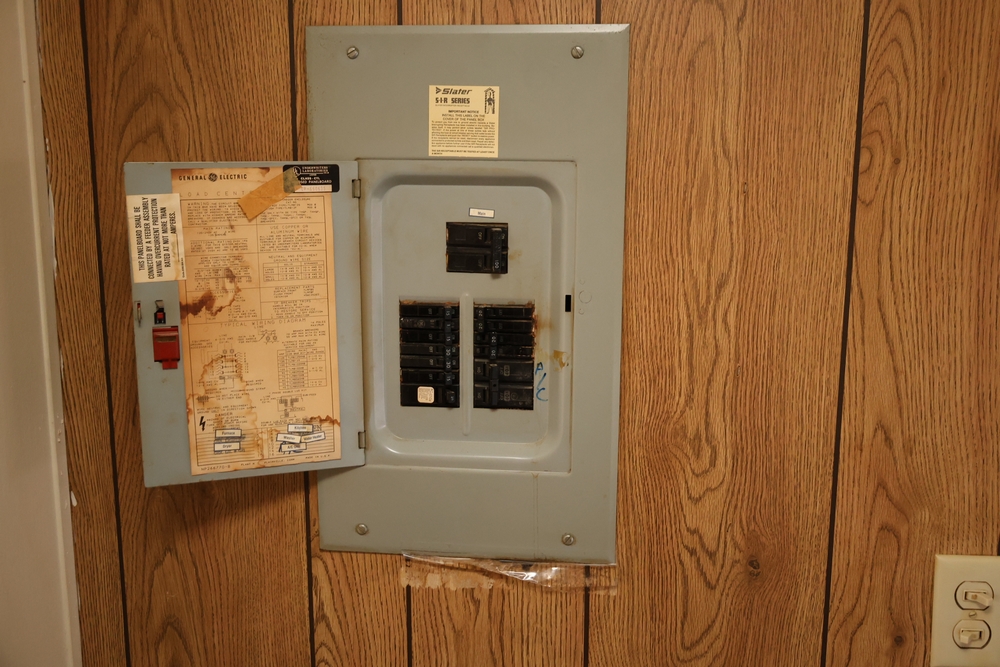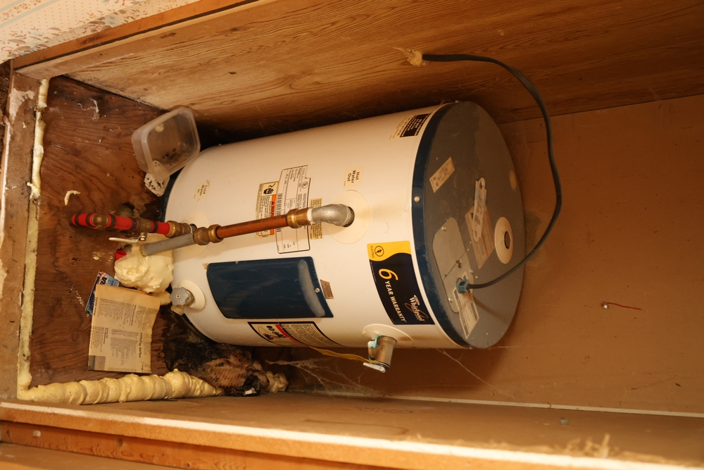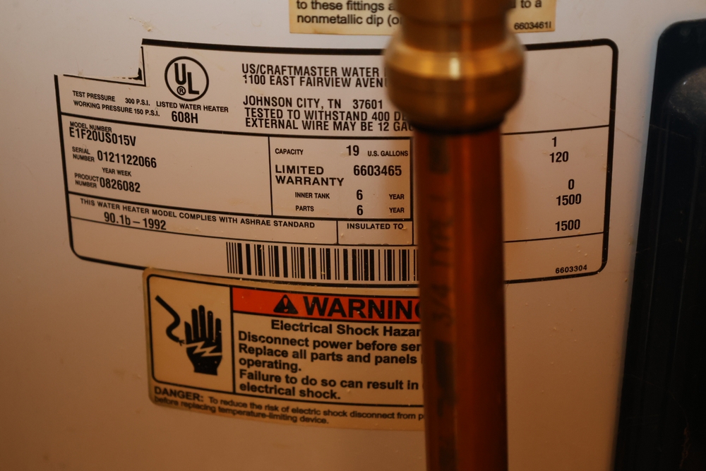 The bathroom includes a vanity with sink, a toilet, and a tub with shower surround, along with wall-mounted shelving and a mirror cabinet. Mechanical and utility components include a US/Craftmaster electric water heater (approximately 19 gallon capacity), an interior electrical panel with breakers, and a Thermo Pride furnace unit, along with a washer and dryer set.