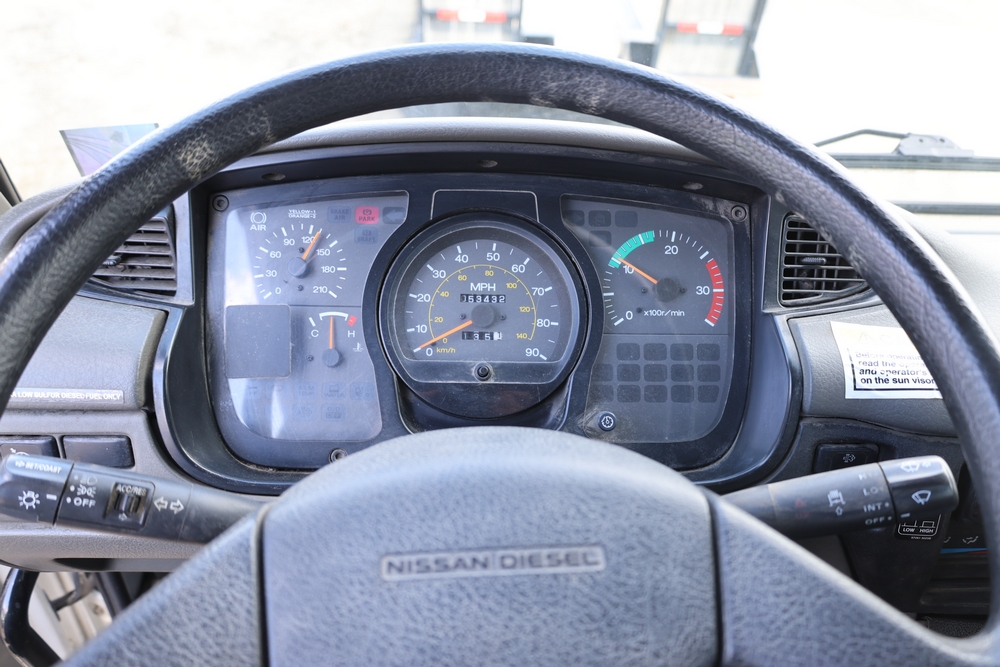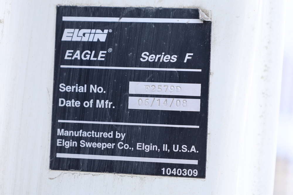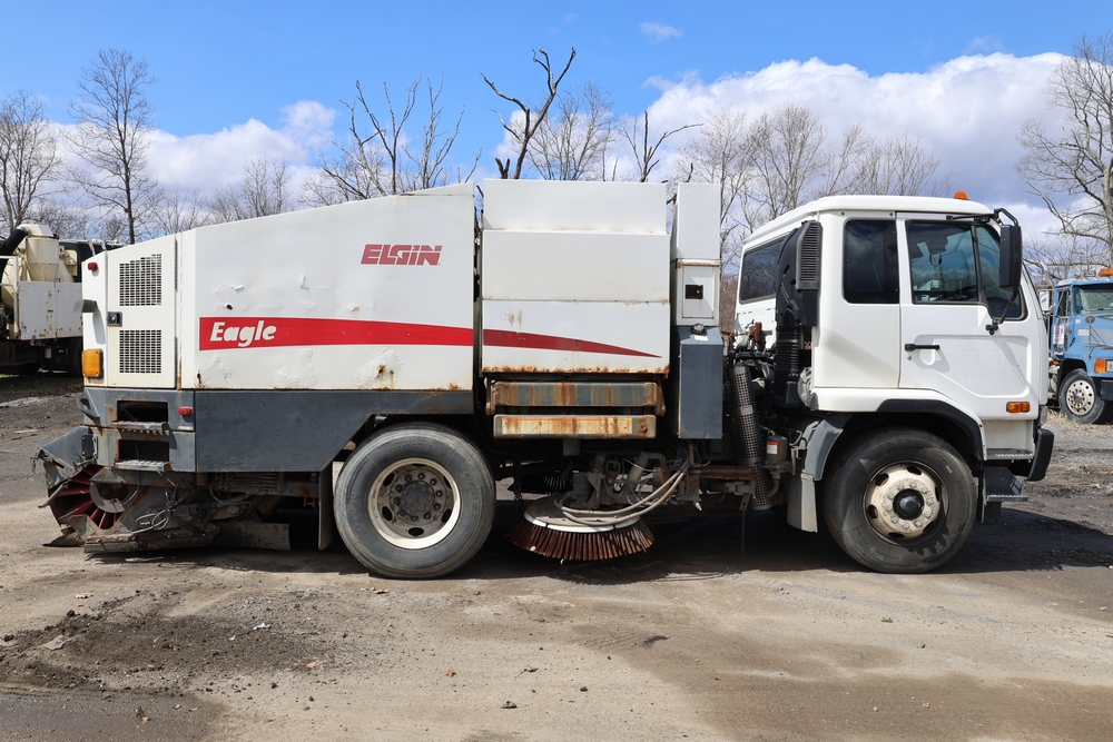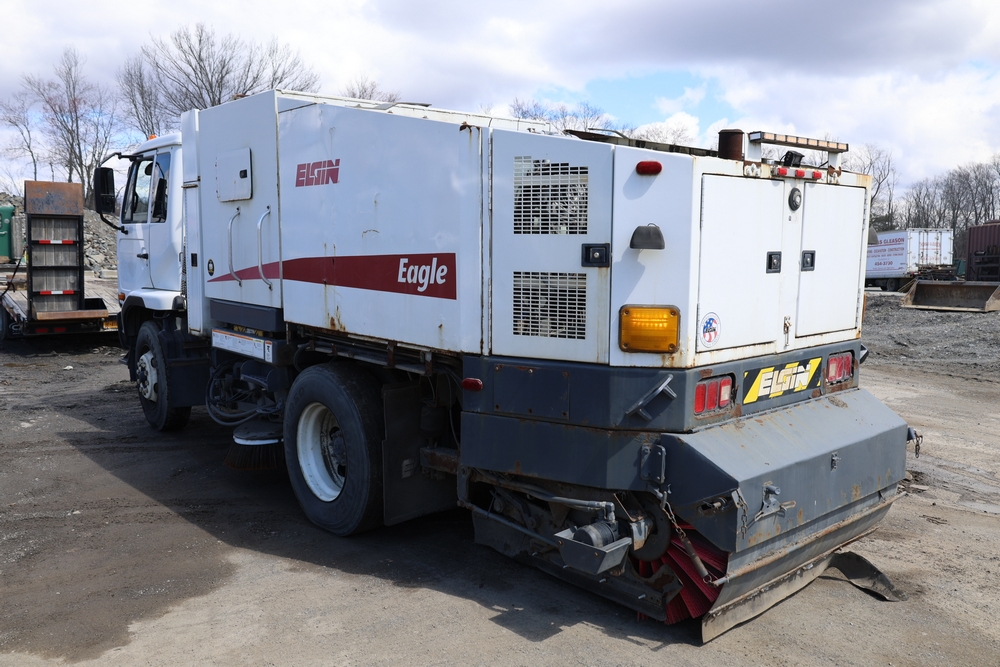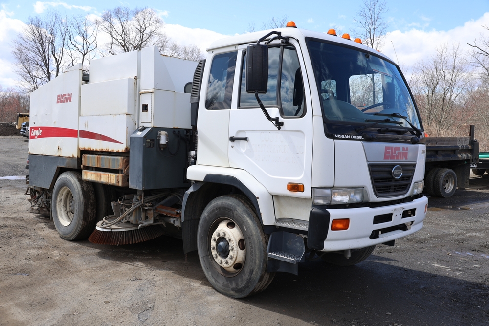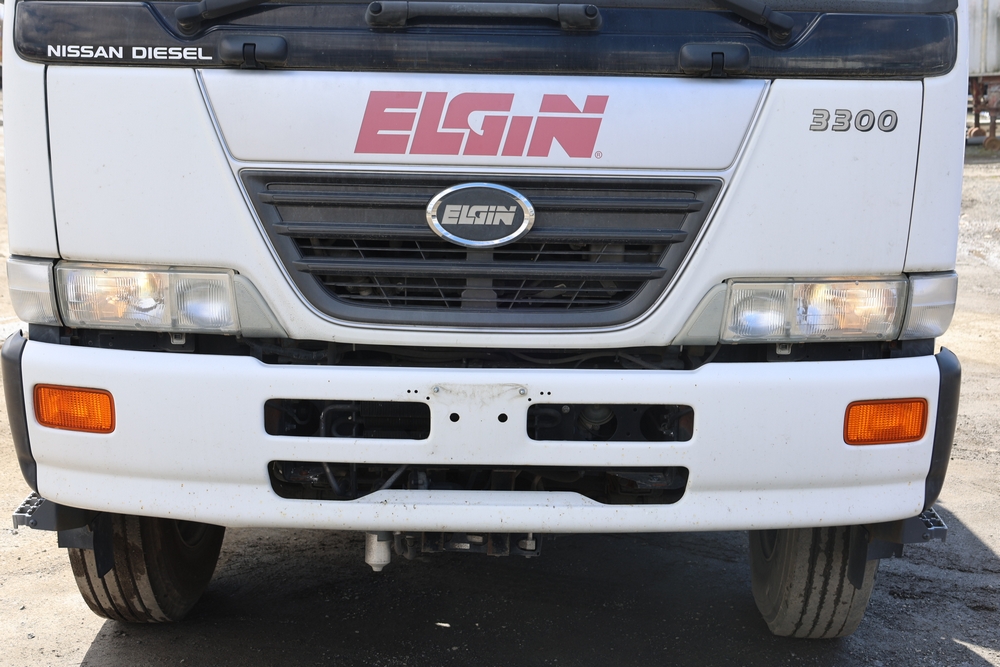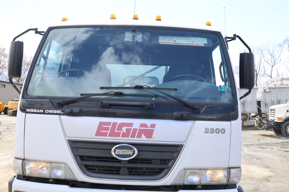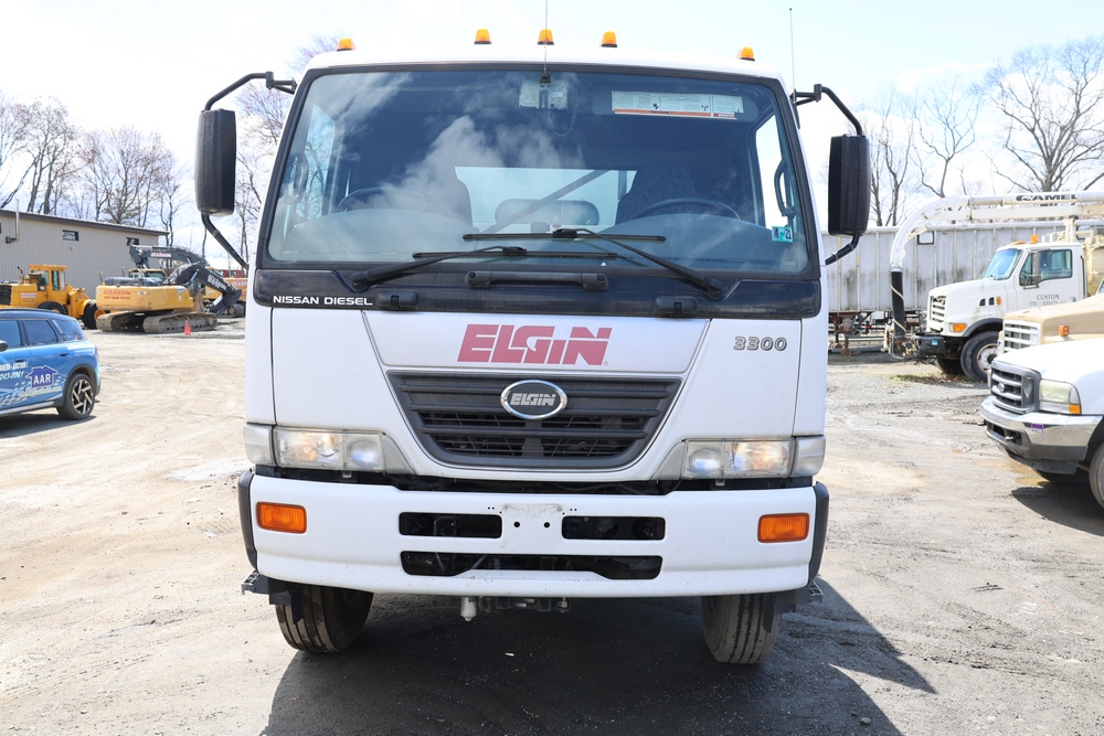 2008 Nissan UD3300 Elgin Sweeper Truck with a J08E-UJ diesel engine. VIN: JNAPC81L98AE70116. Odometer reading: 53432, hour meter reading 3715. Body: truck. Cab over engine configuration; 4x2 drive; air brake system; Elgin Eagle street sweeper body; dual side mounted rotary brushes; rear sweeping assembly; control console with switches and gauges; automatic transmission selector; AM/FM CD radio; heater and air conditioning controls. Runs, drives, and operates. Key and transferable registration available.
