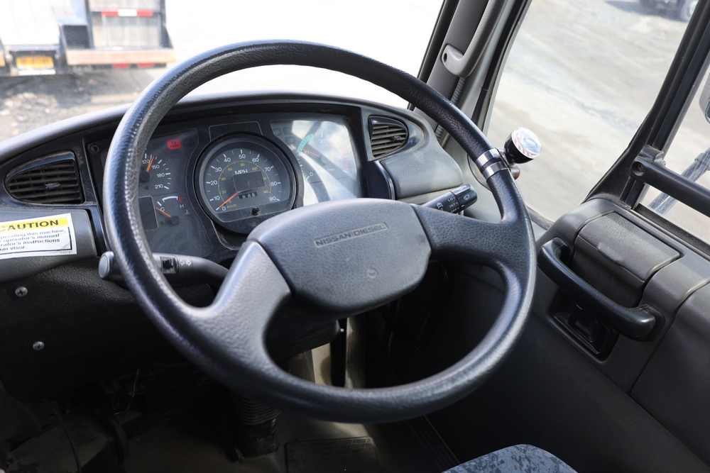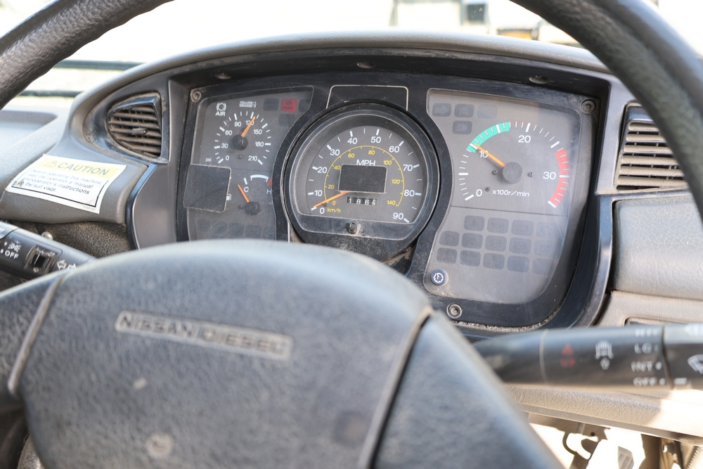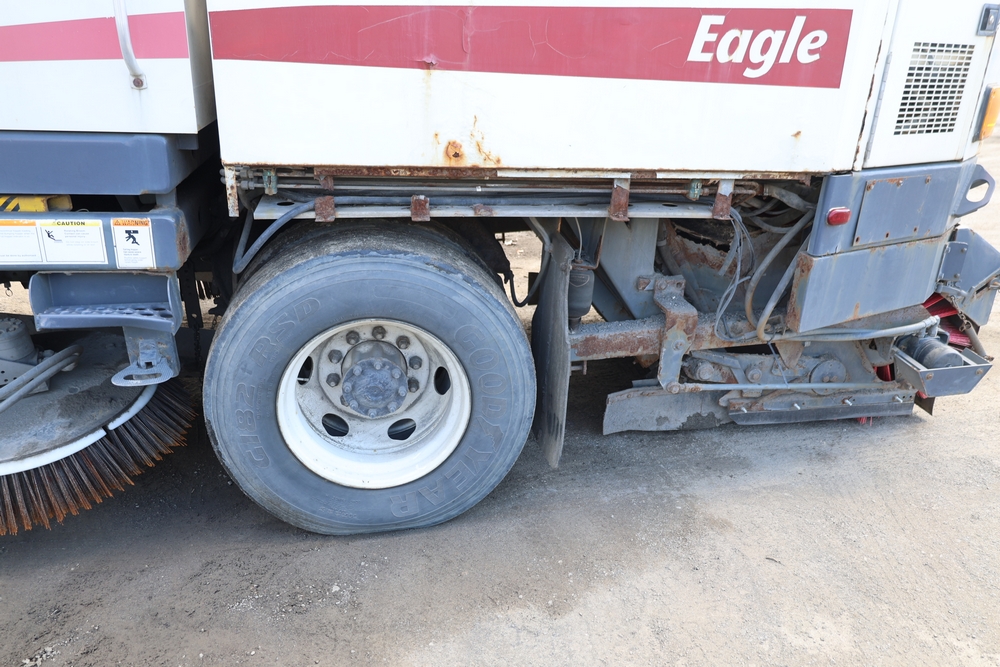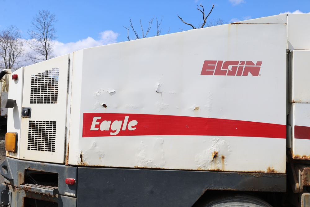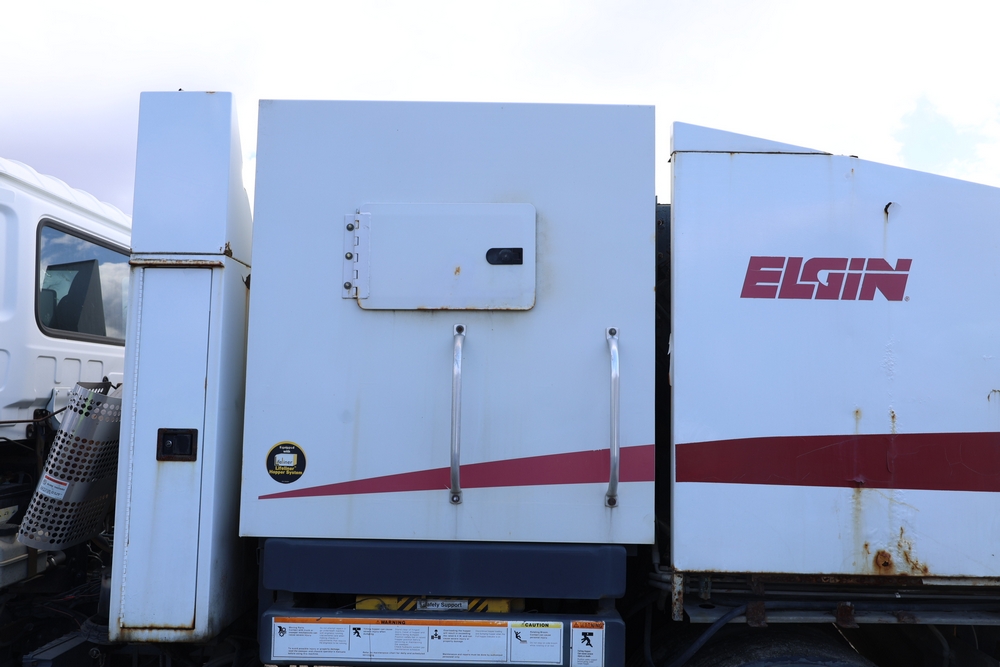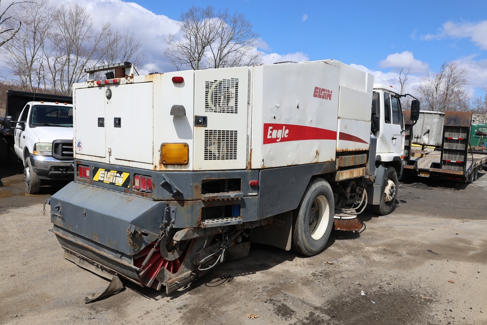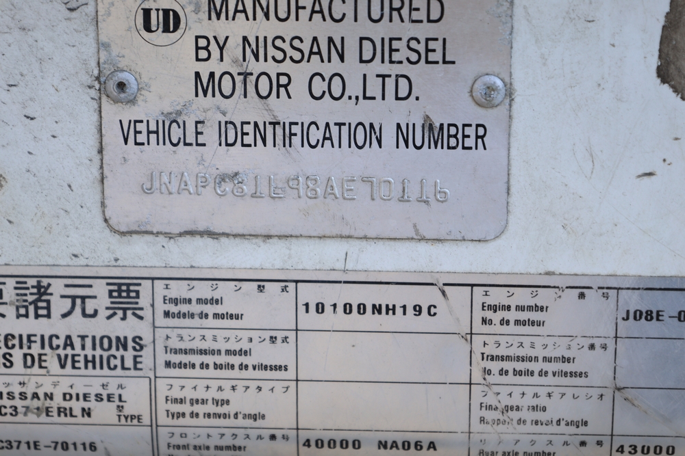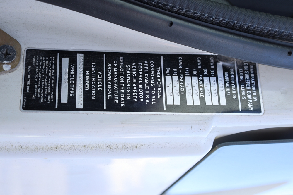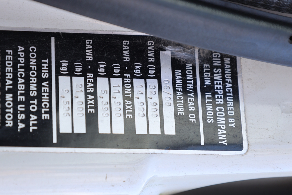 2008 Nissan UD3300 Elgin Sweeper Truck with a J08E-UJ diesel engine. VIN: JNAPC81L98AE70116. Odometer reading: 53432, hour meter reading 3715. Body: truck. Cab over engine configuration; 4x2 drive; air brake system; Elgin Eagle street sweeper body; dual side mounted rotary brushes; rear sweeping assembly; control console with switches and gauges; automatic transmission selector; AM/FM CD radio; heater and air conditioning controls. Runs, drives, and operates. Key and transferable registration available.