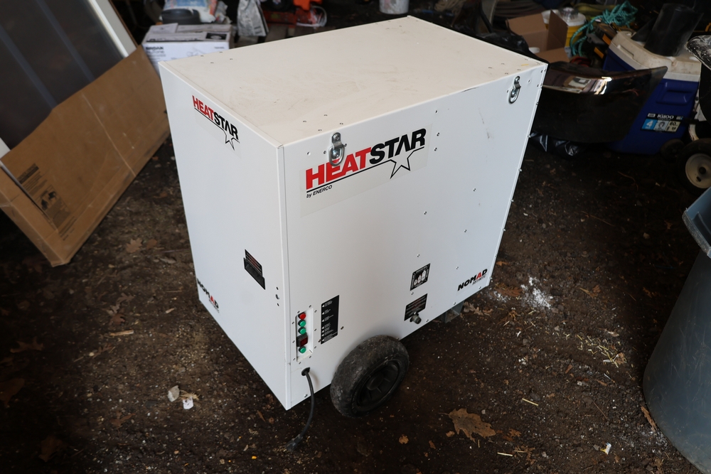 HeatStar by Enerco portable construction heater, model NOMAD HS190TC, wheeled cabinet style with control panel, fuel inlet connection, vented sides, and internal gas control components visible.