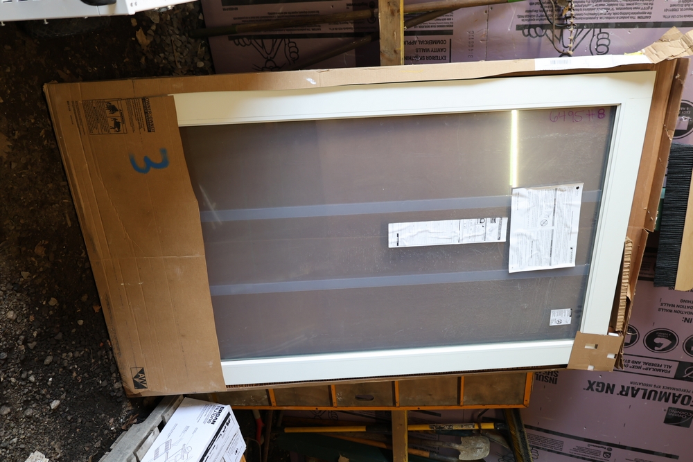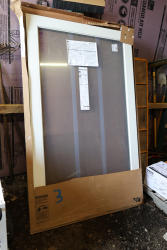 Andersen Windows & Doors sliding patio door panel, white frame, measures approximately 4 ft wide by approximately 79 in tall, new in box with paperwork attached.