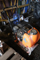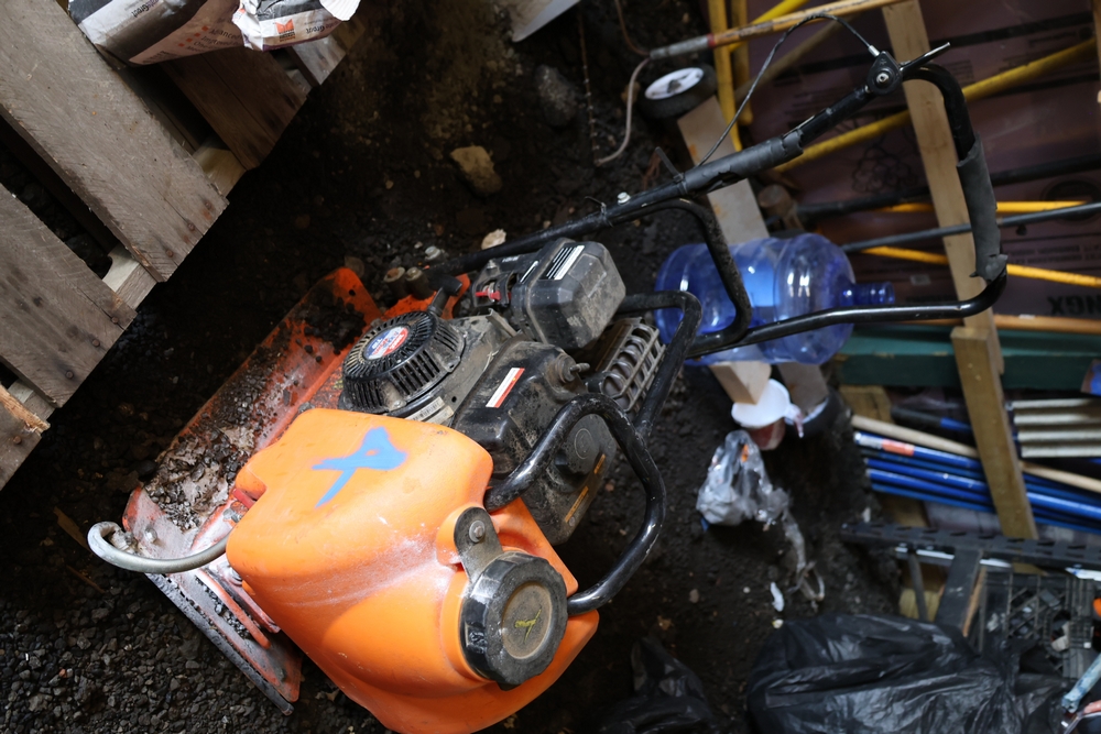 SuperHandy plate compactor, 20 in x 15 in plate size, 4200 lb force, 5500 VPM, AlphaWorks 209cc 7HP gas engine, includes integrated water tank and transport wheels.