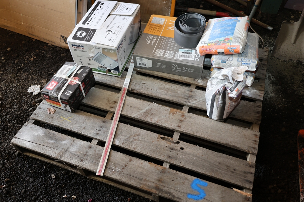 Mixed lot including Mapei Ultracolor Plus FA grout bags, Polyblend high performance grout, Roppe 700 Series TPR rubber wall base 4 in x 120 in x 1/8 in, Broan NuTone 765H80L ventilation fan with light and heater, Grip Rite collated framing nails 2-3/8 in x .113 in, and trim pieces.