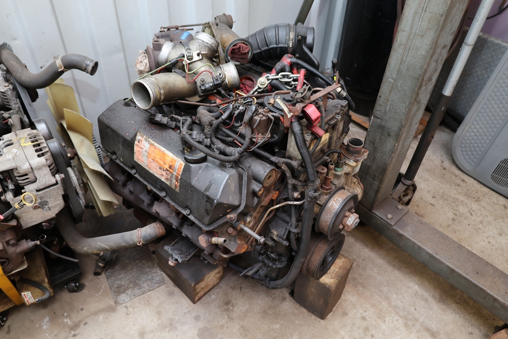 Ford 7.3L diesel engine removed from a 1999 Ford truck. Engine assembly with Garrett turbocharger, includes intake piping, wiring harness, control module (P/N 1831022C97), pulleys, and exhaust components. Seller reports in working condition