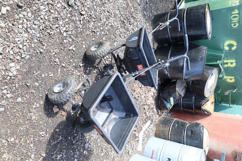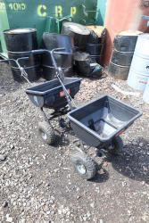Agri-Fab push broadcast spreaders, includes two units with poly hoppers, wheeled frames, and handle controls.