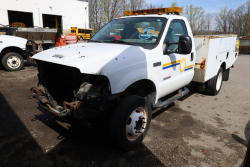 2003 Ford F-550 Regular Cab 2WD DRW utility/service truck with a 6.0L V8 OHV 32V turbo diesel engine. VIN: 1FDAF56P93EC75387. Body: chassis and cab with utility body. Automatic transmission; dual rear wheels; PTO controls; cab mounted amber light bar; rear work platform with hose reel; side compartment tool storage; power inverter with outlet; AM/FM radio; heater and air conditioning controls; manual windows and locks; Hobbs meter showing 13924 hours. Mileage unknown. Does not run. Title available.