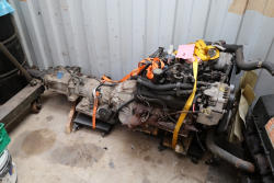 Engine and transmission assembly removed from 2000 Chevrolet S10, includes V6 engine, automatic transmission, alternator, fan, intake, wiring, and exhaust manifolds.