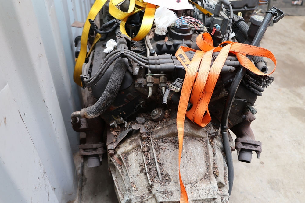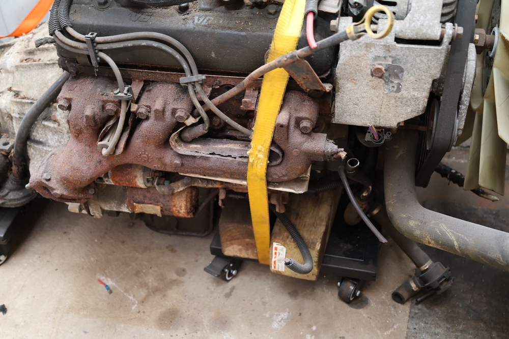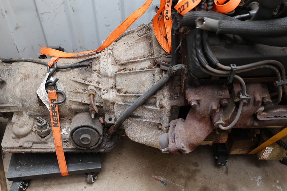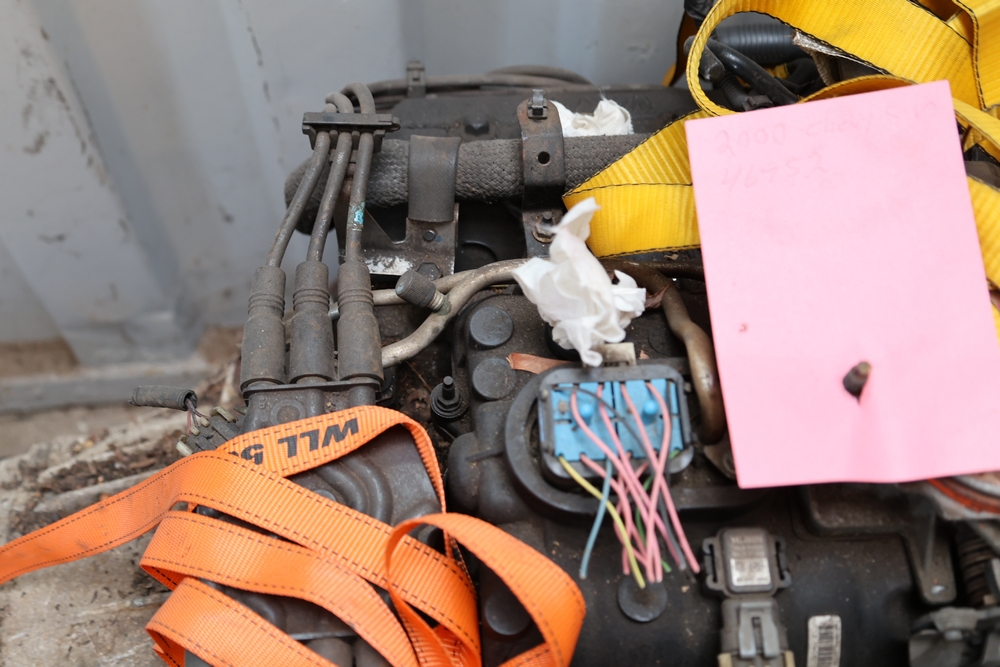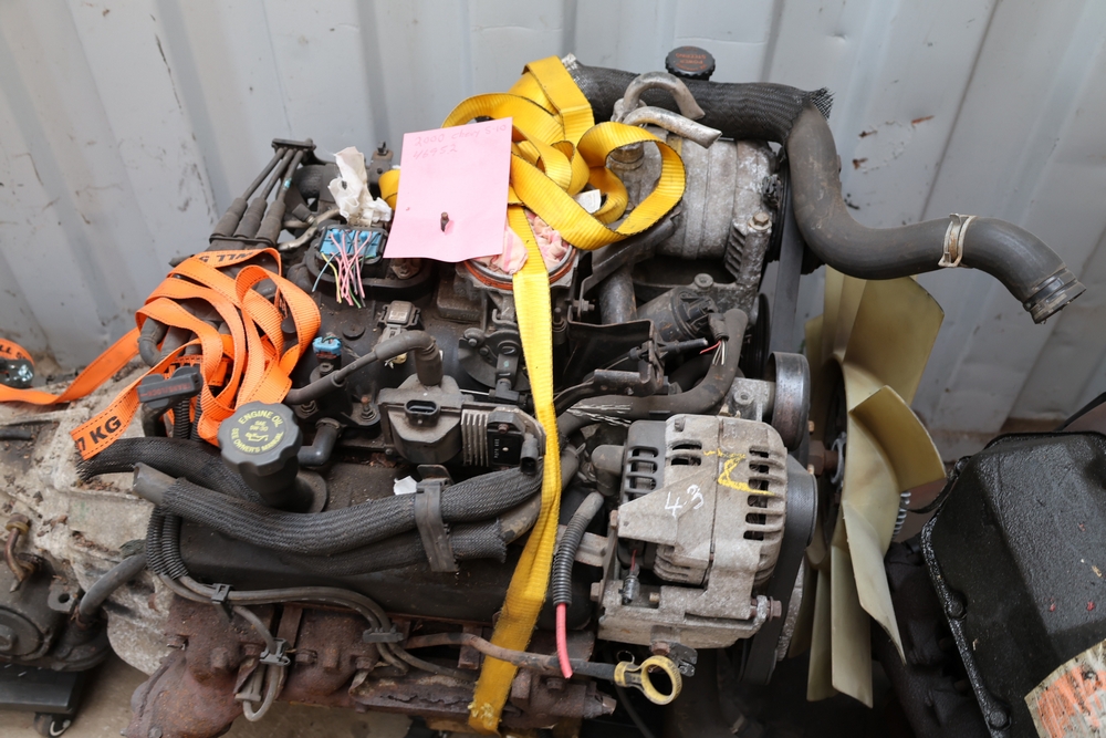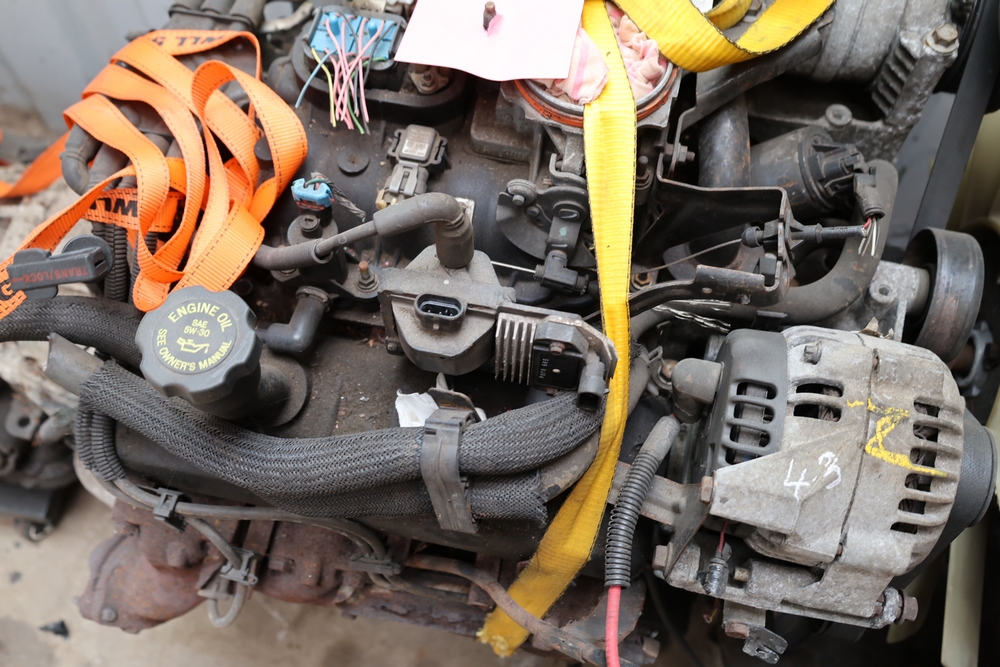 Engine and transmission assembly removed from 2000 Chevrolet S10, includes V6 engine, automatic transmission, alternator, fan, intake, wiring, and exhaust manifolds.