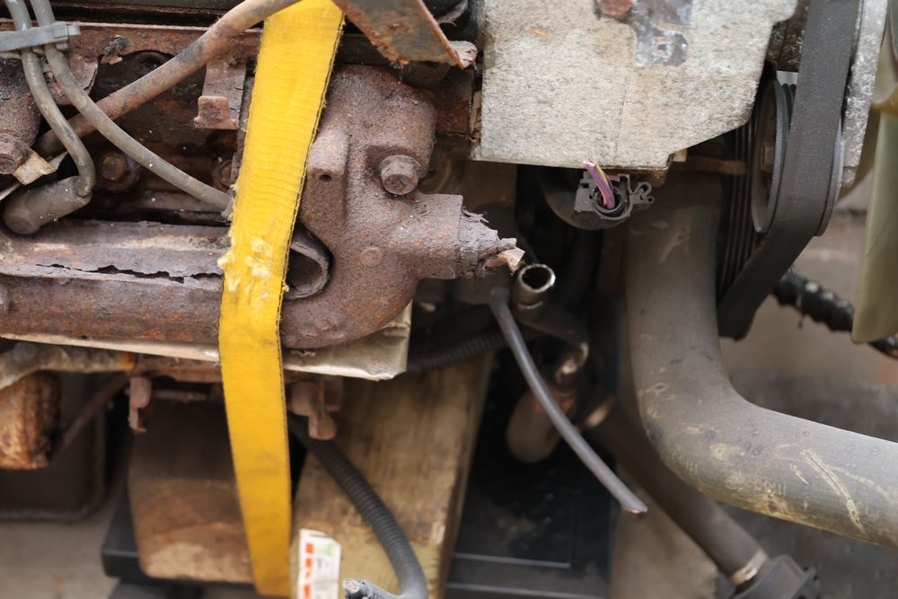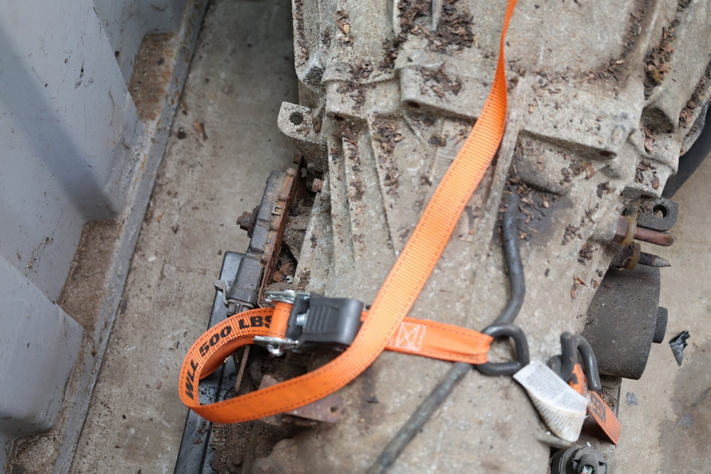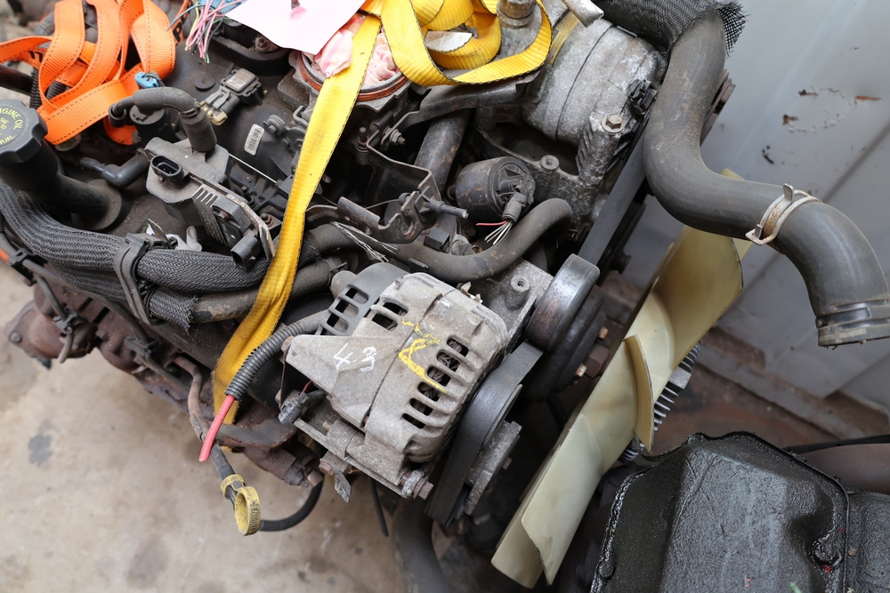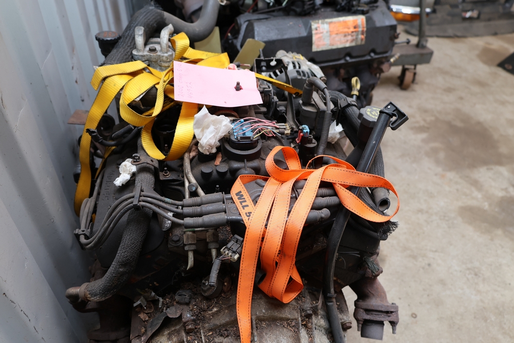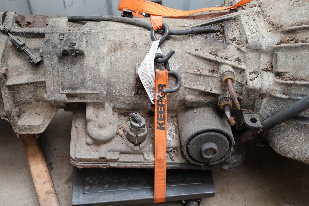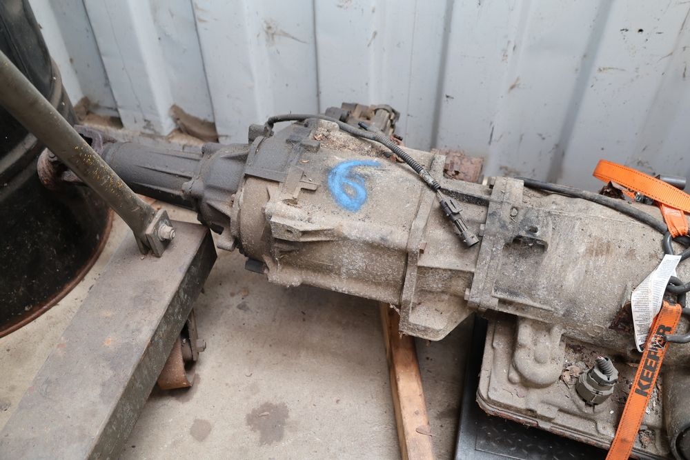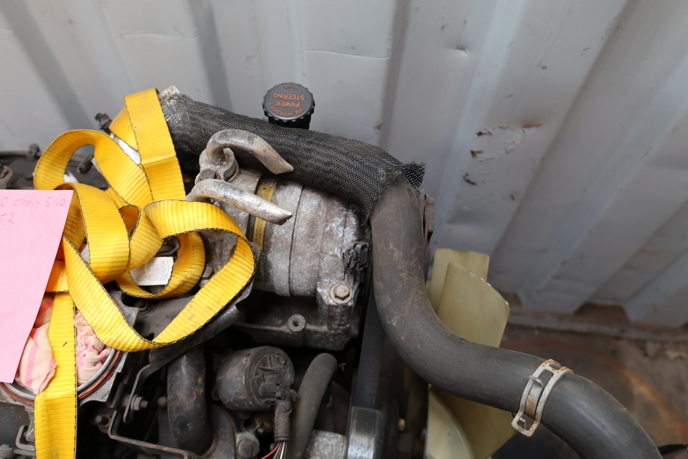 Engine and transmission assembly removed from 2000 Chevrolet S10, includes V6 engine, automatic transmission, alternator, fan, intake, wiring, and exhaust manifolds.