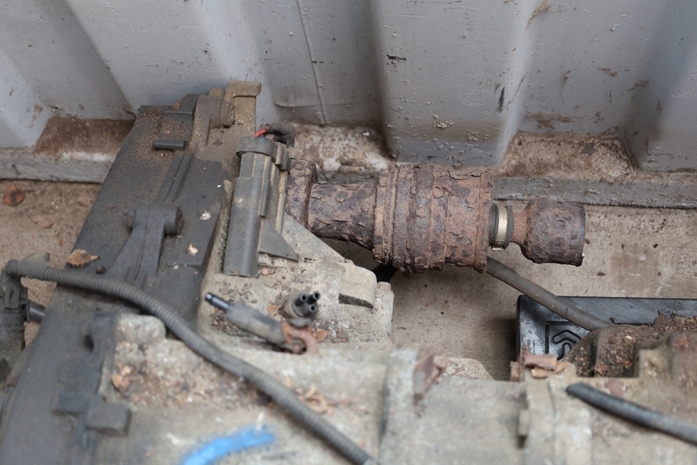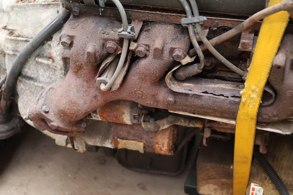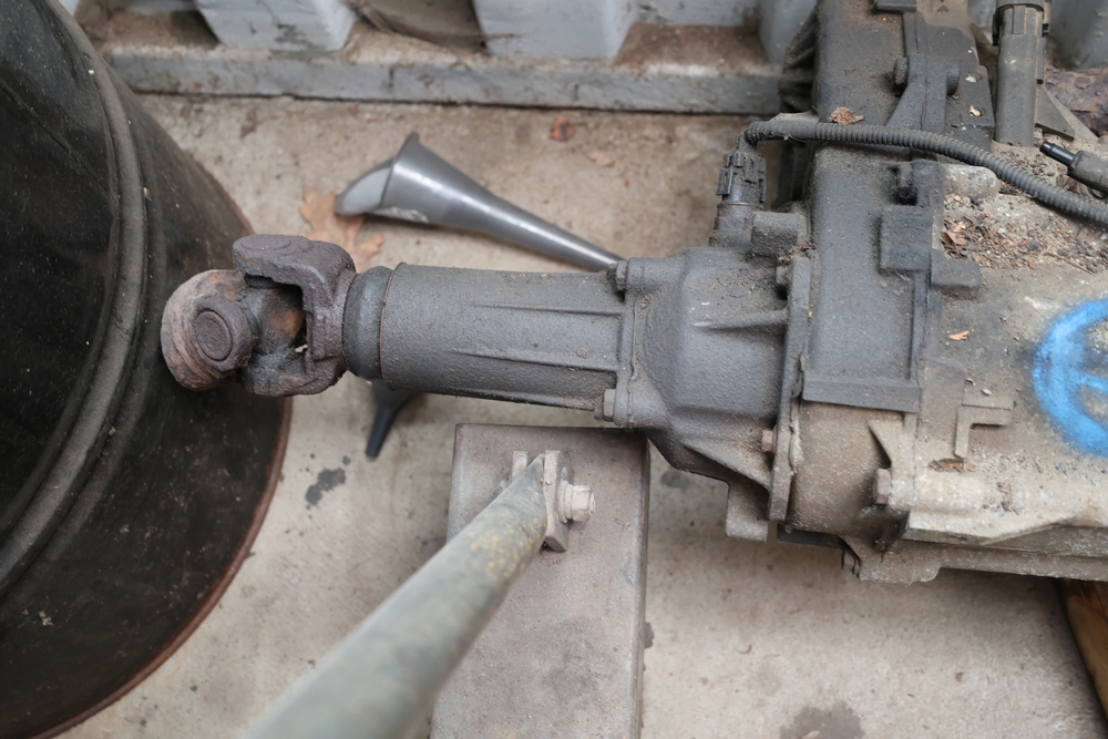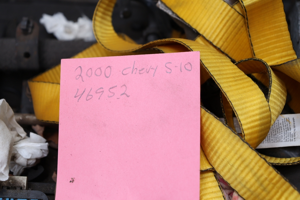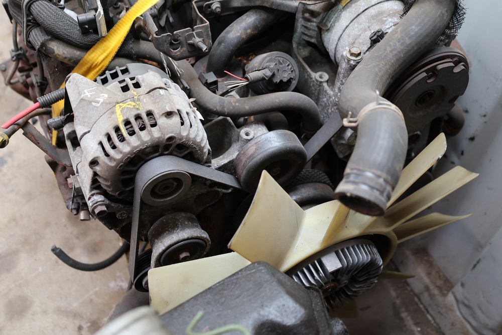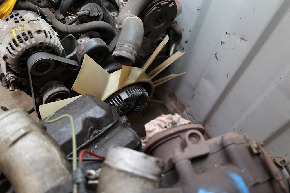 Engine and transmission assembly removed from 2000 Chevrolet S10, includes V6 engine, automatic transmission, alternator, fan, intake, wiring, and exhaust manifolds.