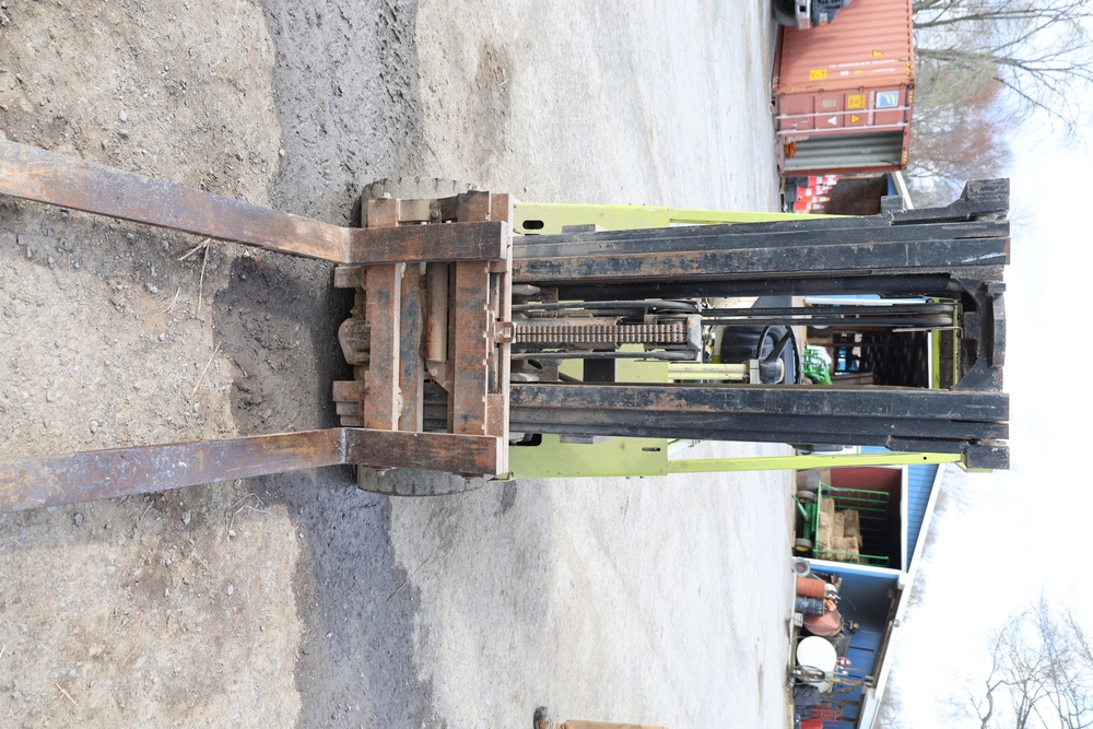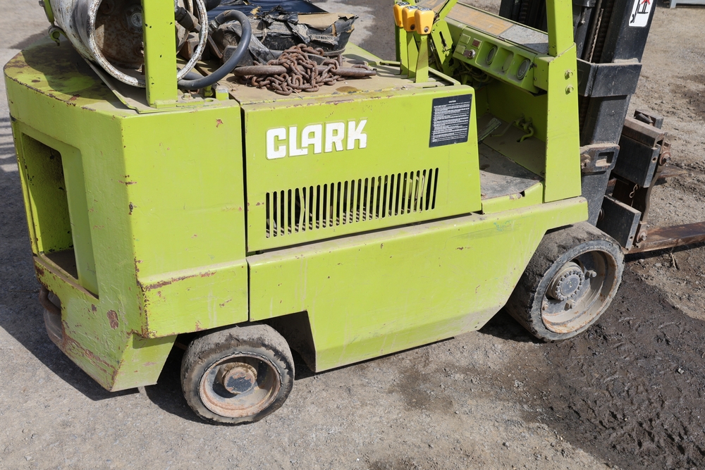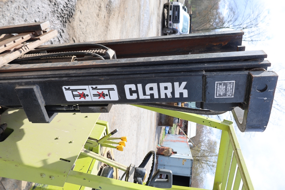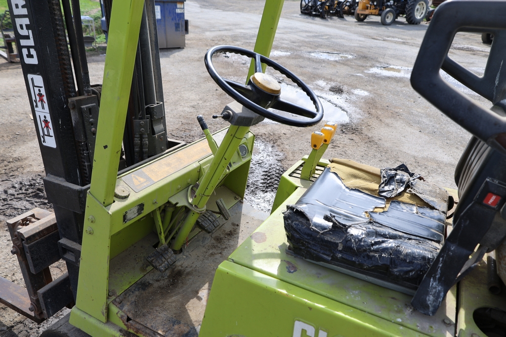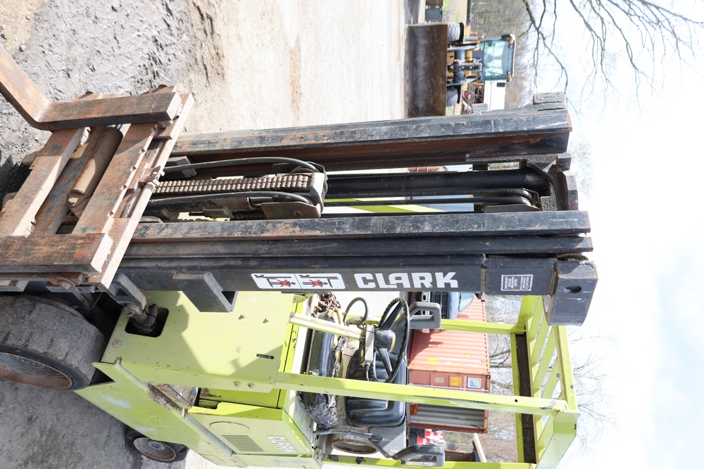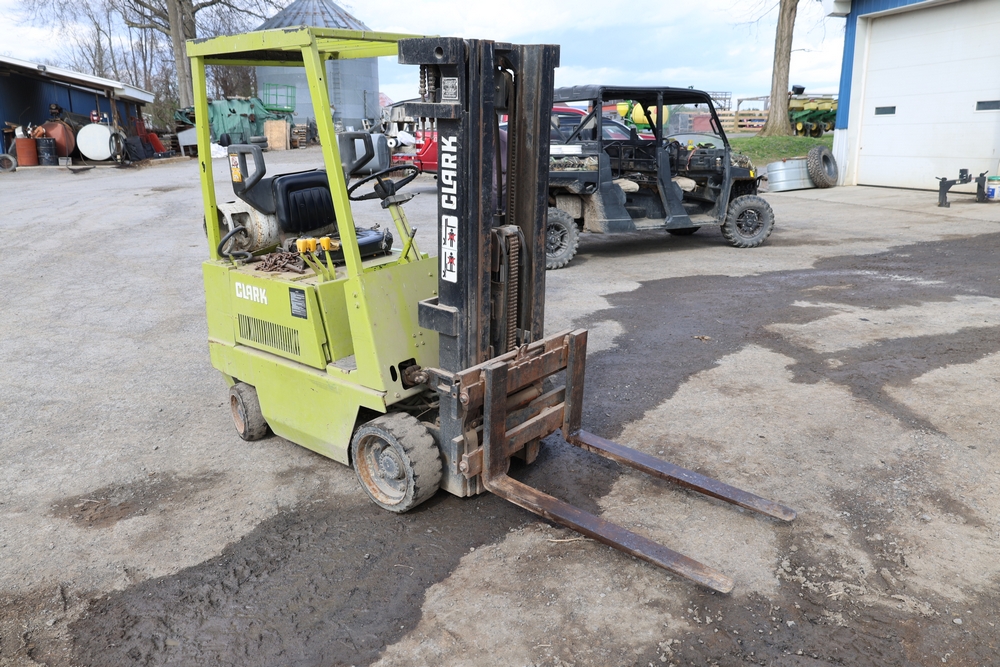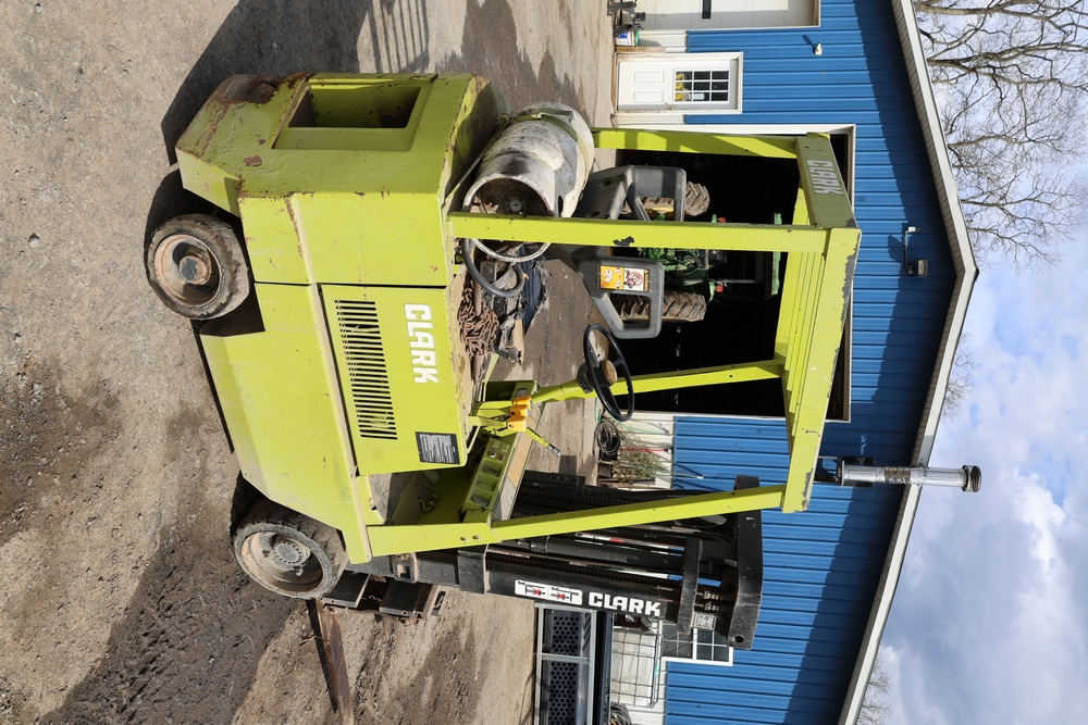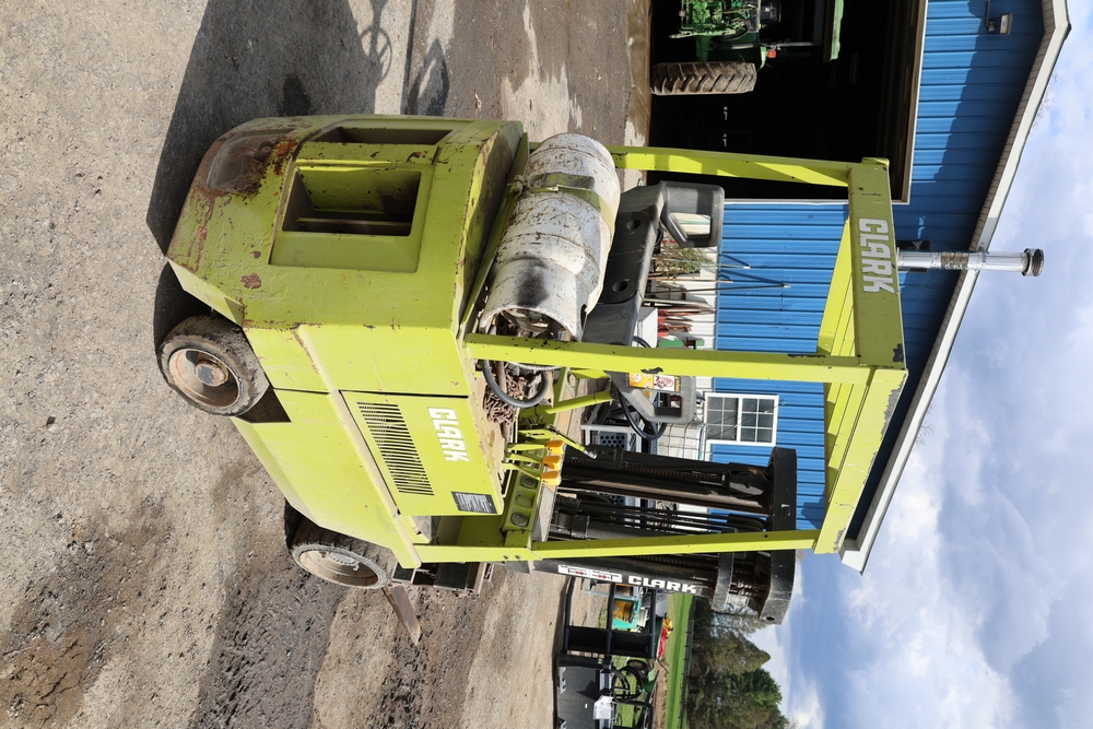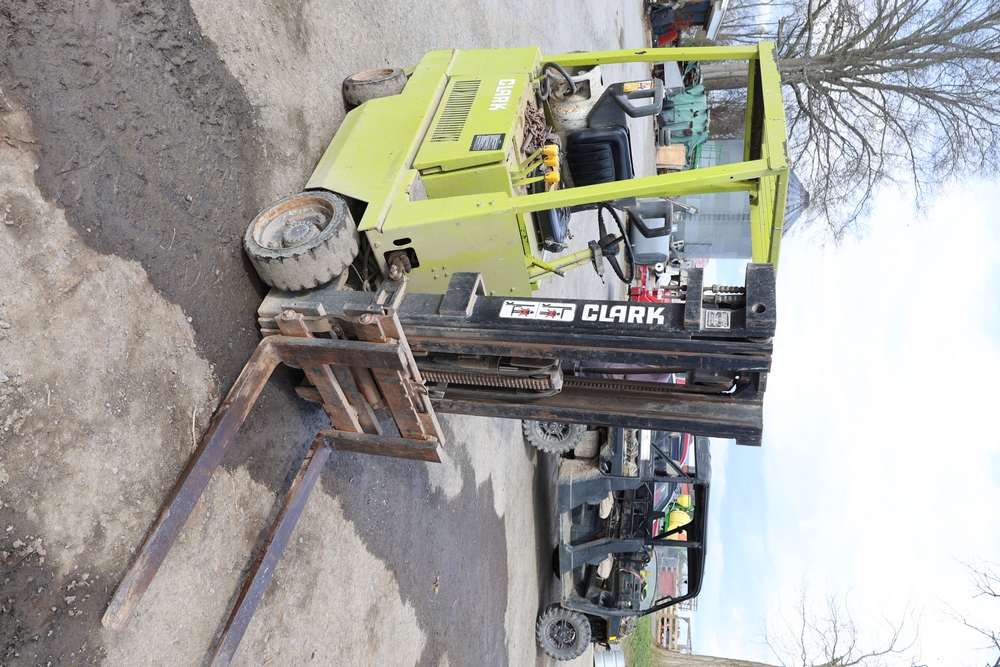 Items include Clark GCS15 forklift; Wain Roy excavator bucket; Armstrong All Traction Field & Road agricultural tires; precast concrete jersey barriers; steel loader quick attach plate; Renken fiberglass sailboat; F.S. Converse Co. coal handling conveyor; straw wattles erosion control logs; stainless steel gas-fired kettles; American Range commercial stainless steel floor fryer & more. Items are located in Rhinebeck, NY.