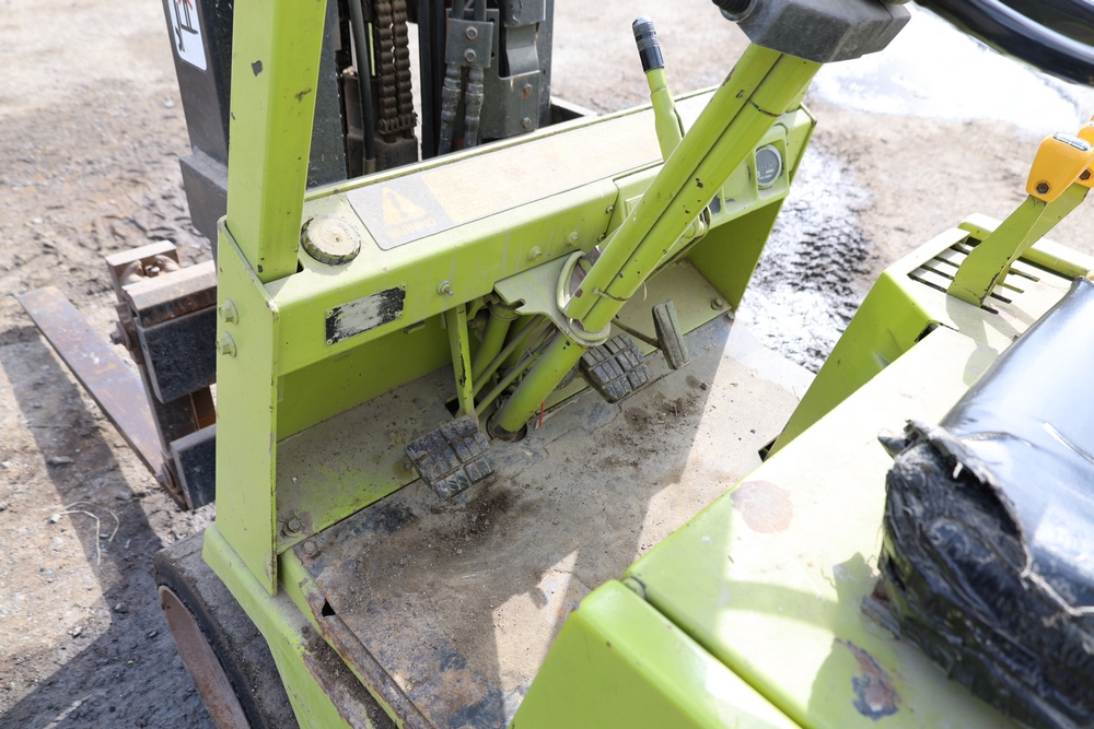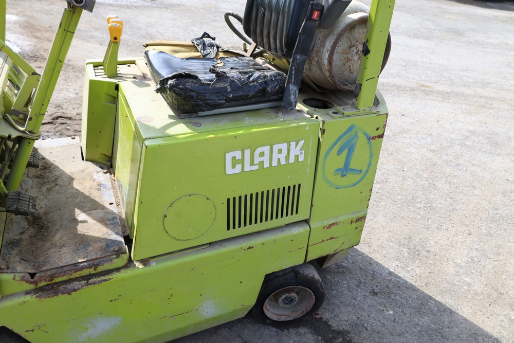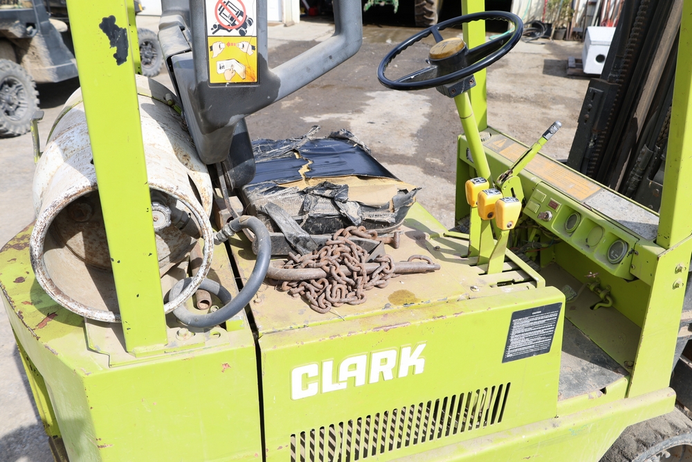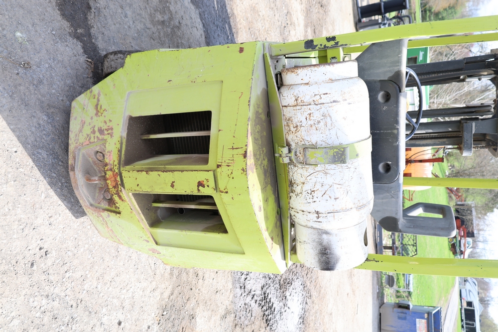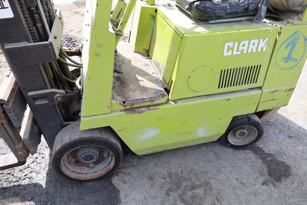 Clark GCS15 forklift with overhead guard, front forks and mast assembly, propane tank mounted on rear, operator seat, steering wheel and control levers, foot pedals, hour meter showing 3429 hours, data plates present, serial number G127-0125-630FA. Runs, drives, and operates.