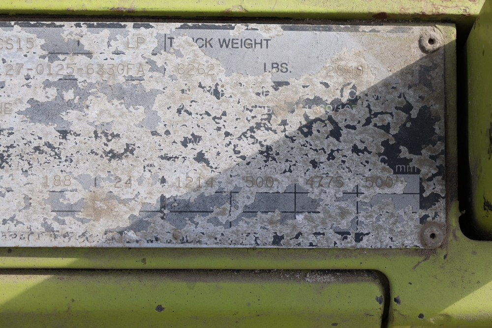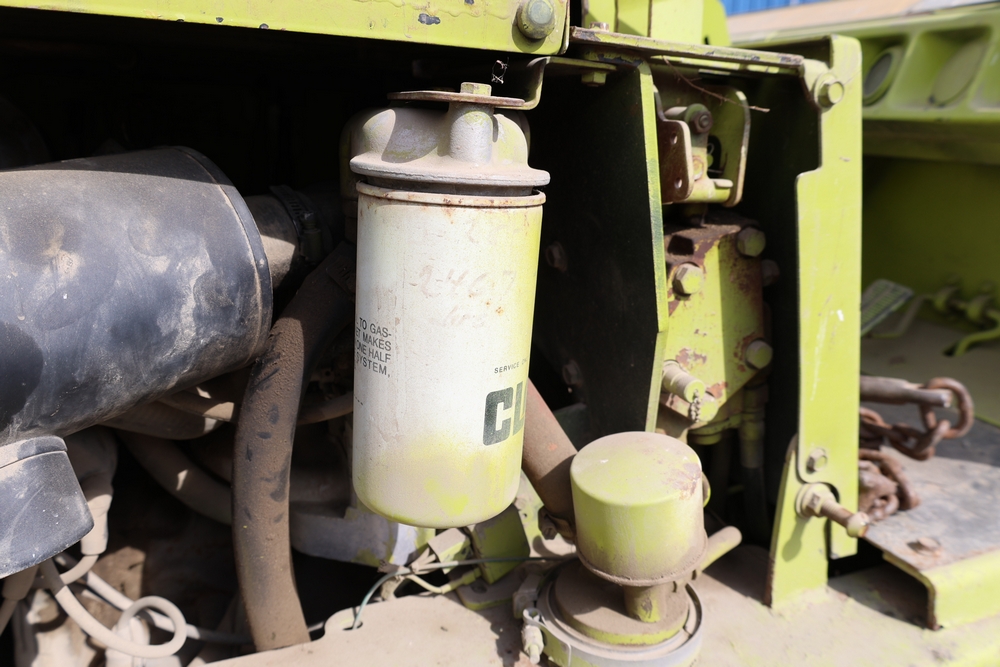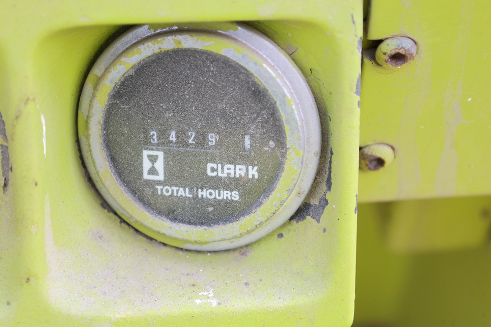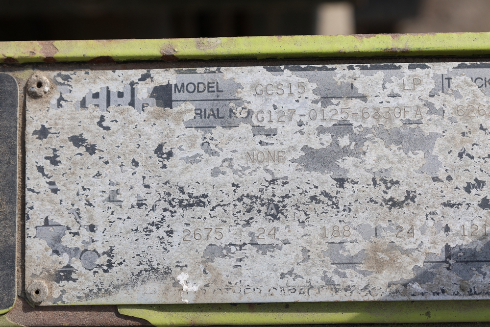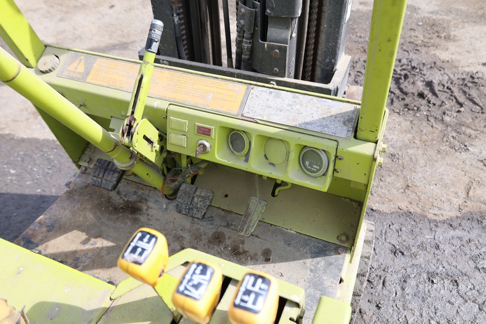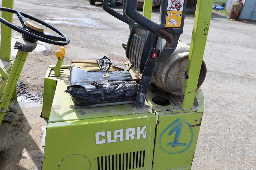 Clark GCS15 forklift with overhead guard, front forks and mast assembly, propane tank mounted on rear, operator seat, steering wheel and control levers, foot pedals, hour meter showing 3429 hours, data plates present, serial number G127-0125-630FA. Runs, drives, and operates.