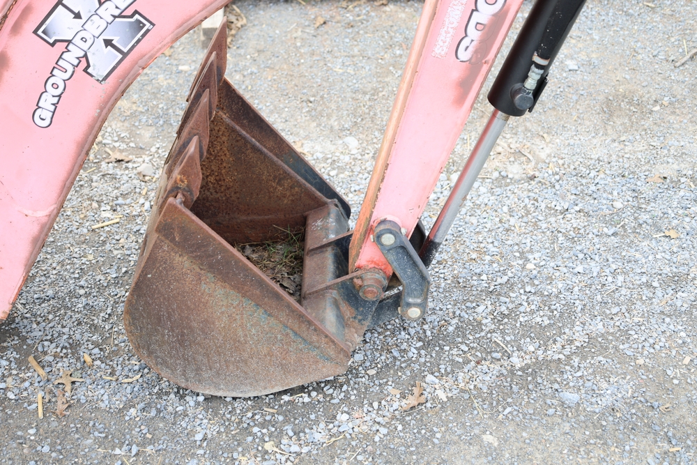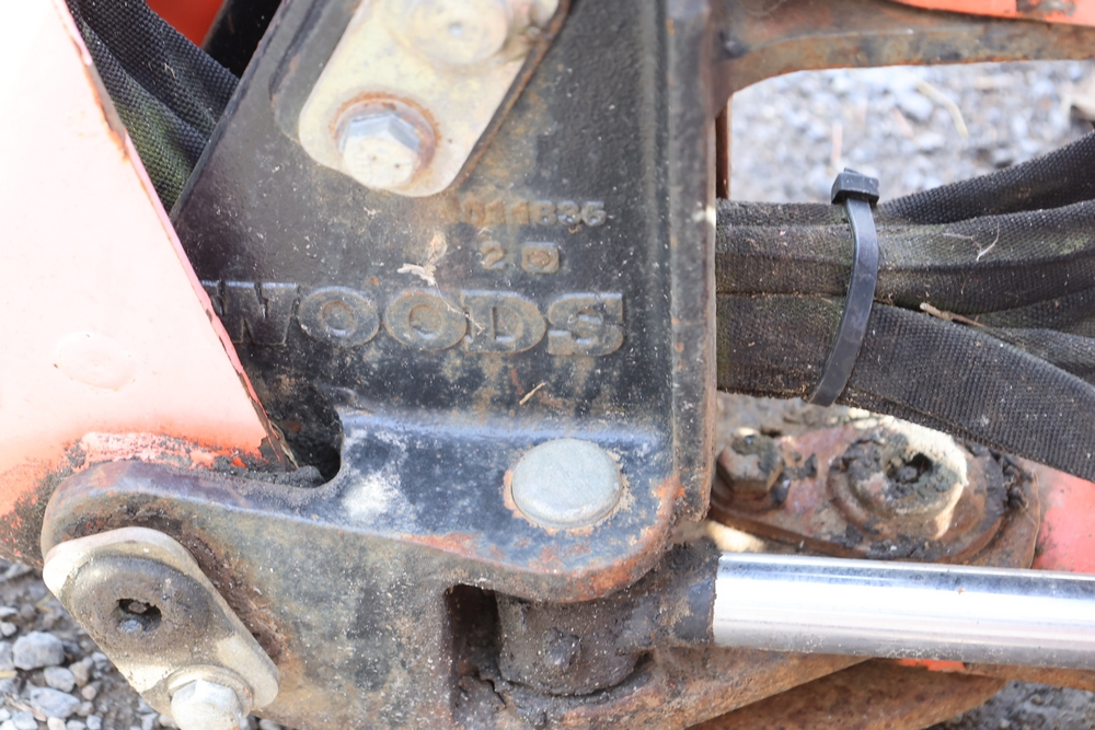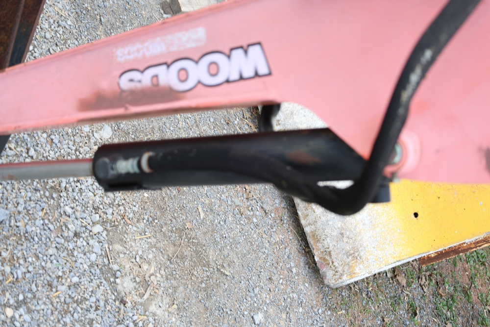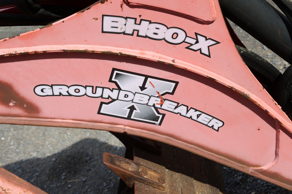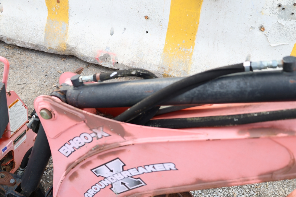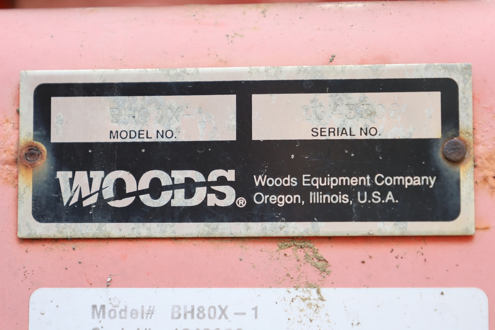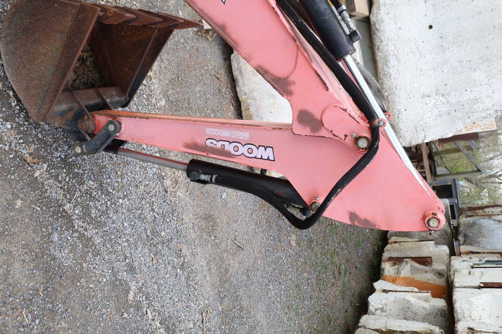 Woods Groundbreaker BH80-X1 backhoe attachment with hydraulic boom and bucket, dual control levers, mounting frame, stabilizer legs, and hydraulic hose connections.