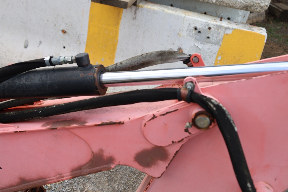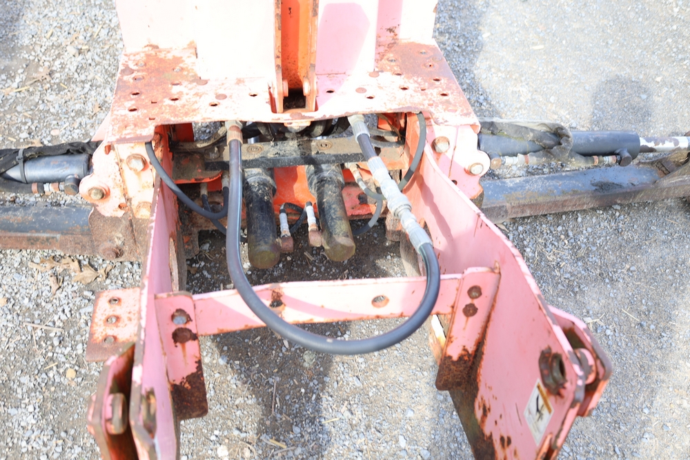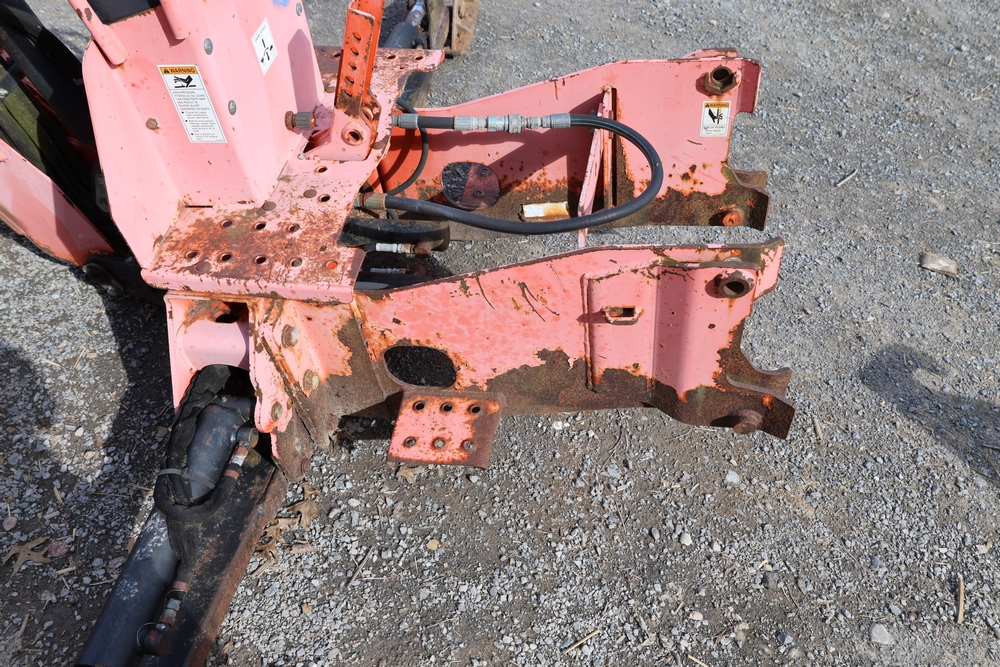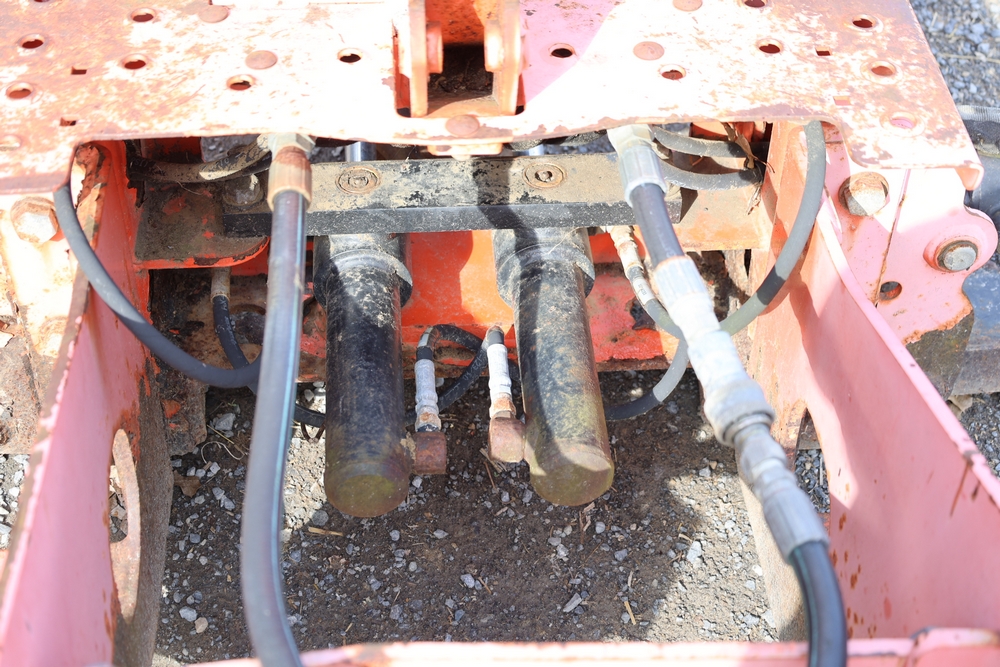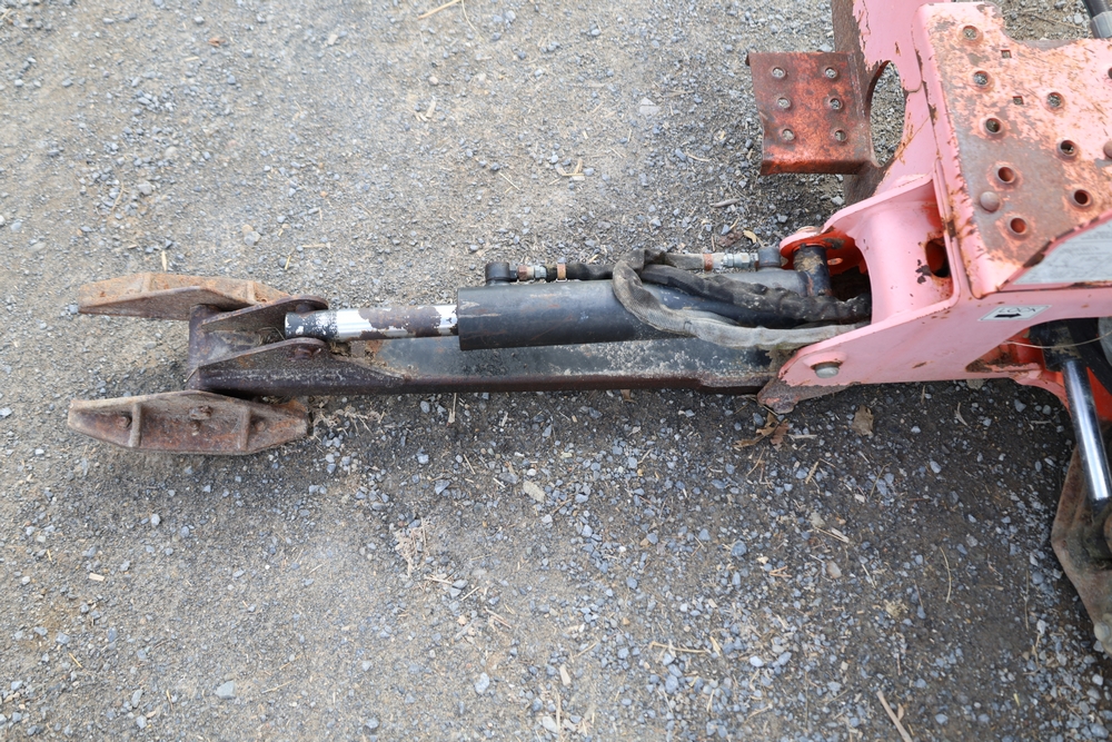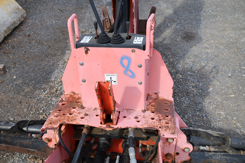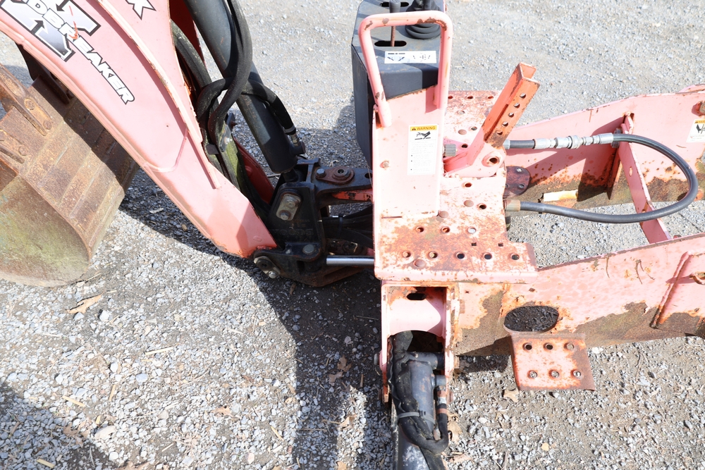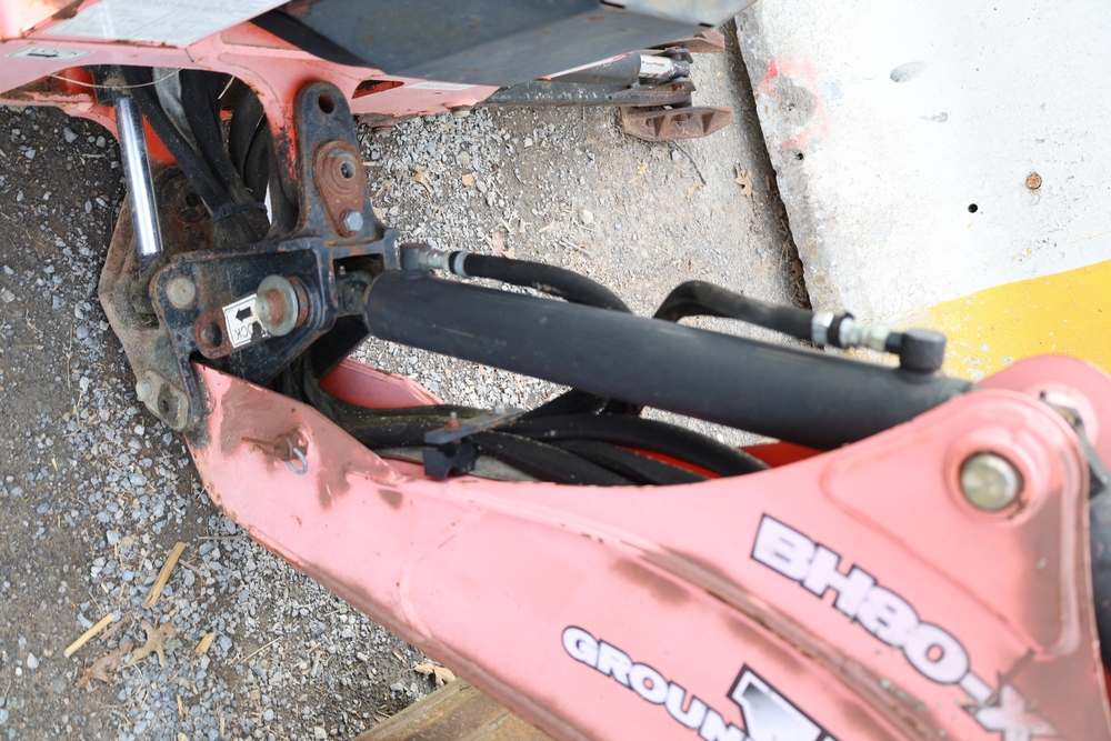 Woods Groundbreaker BH80-X1 backhoe attachment with hydraulic boom and bucket, dual control levers, mounting frame, stabilizer legs, and hydraulic hose connections.