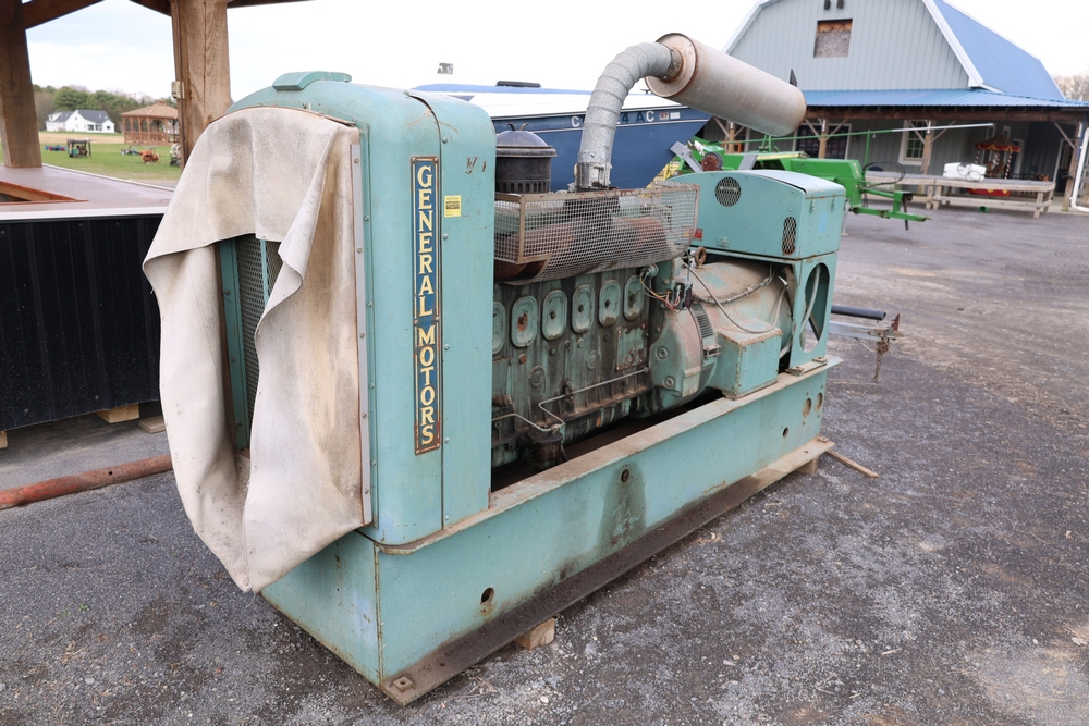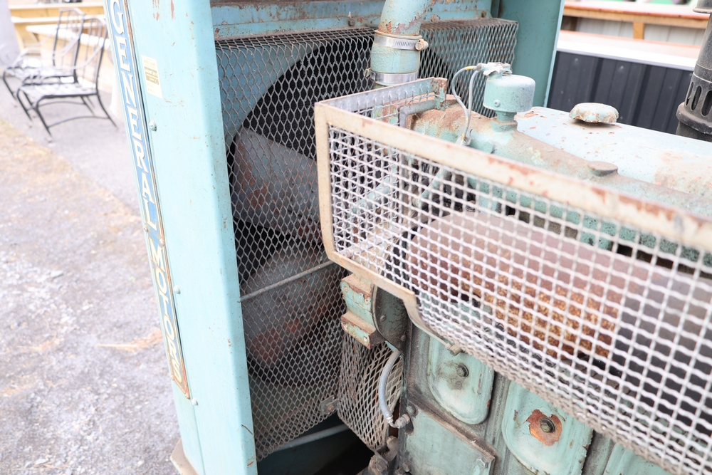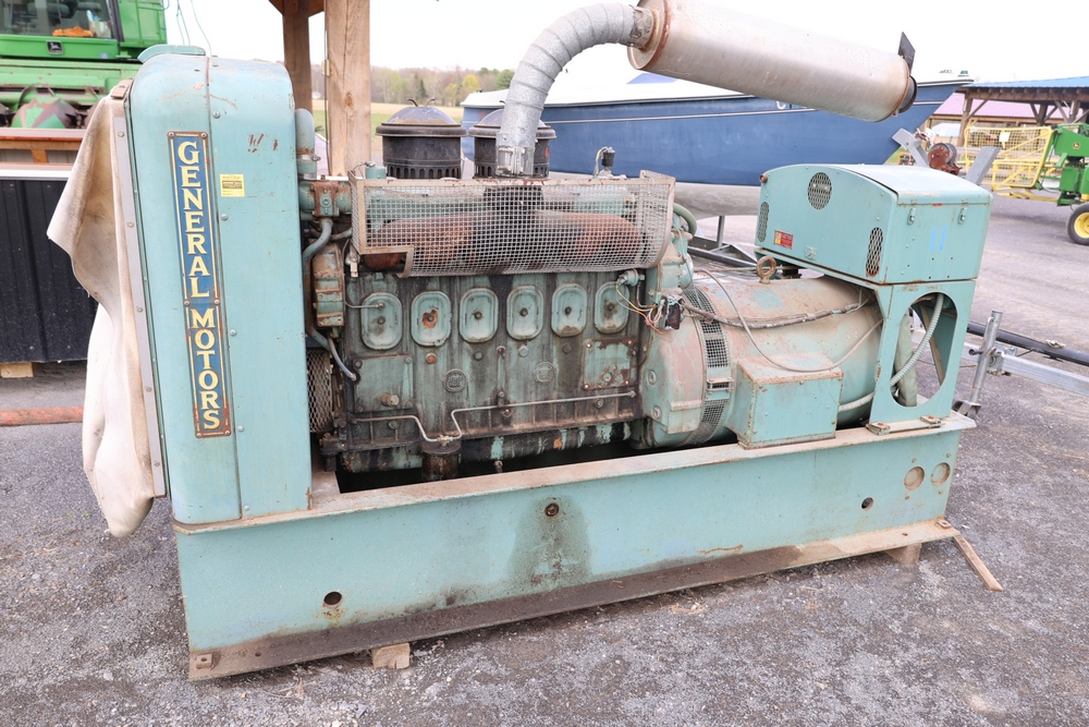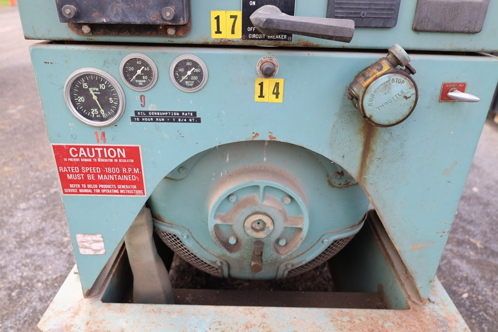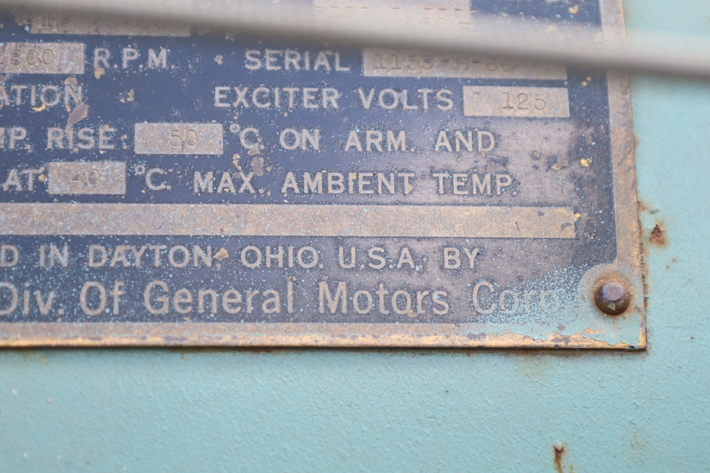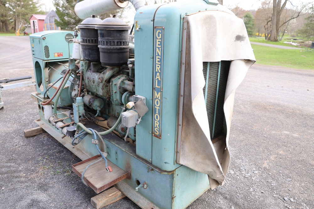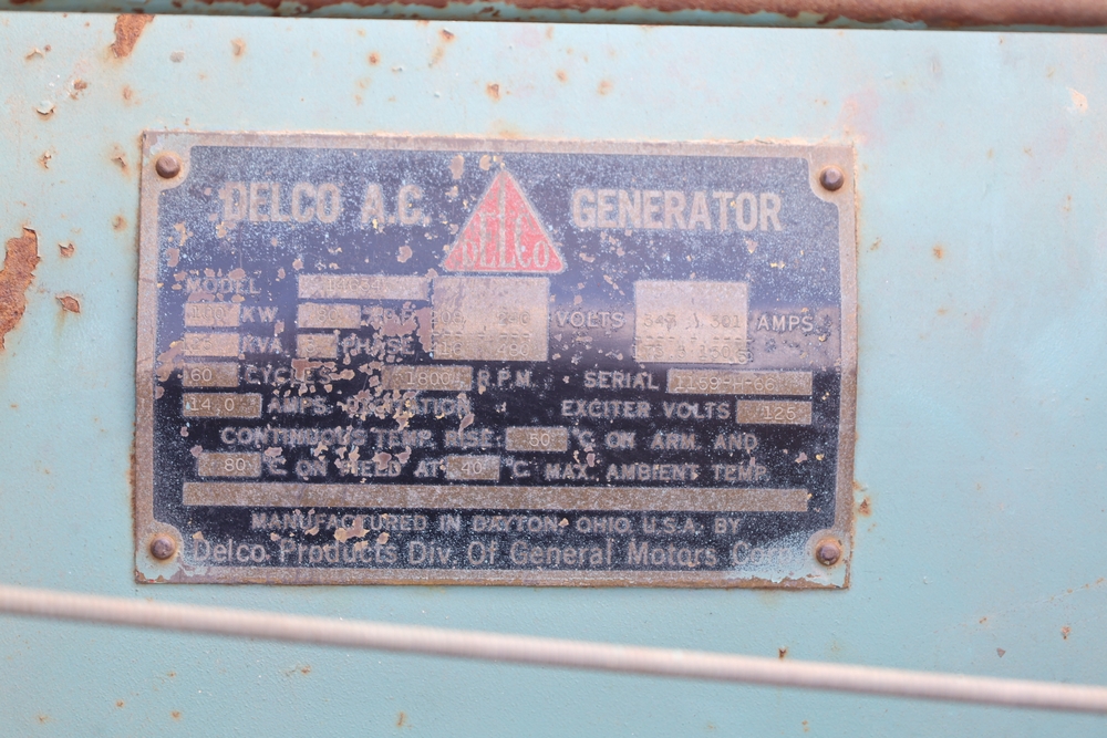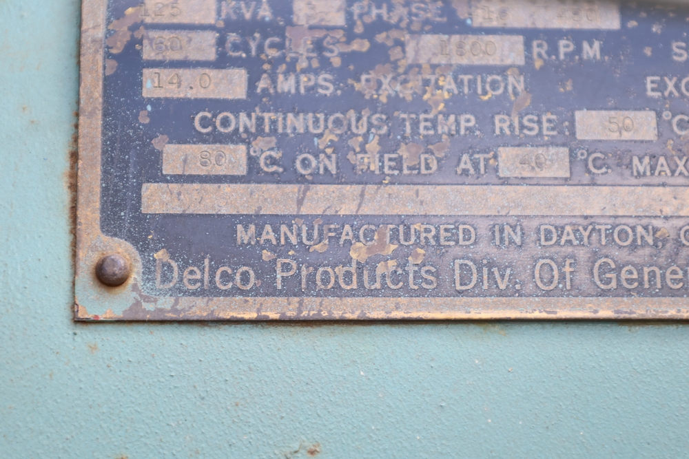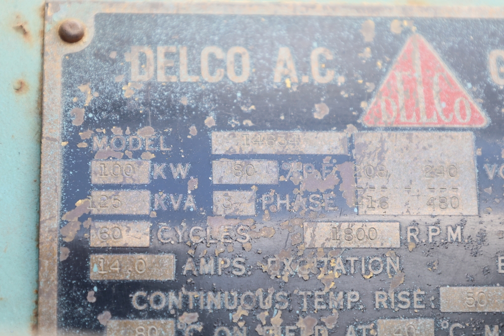 Delco A.C. generator unit with General Motors engine, model 146834, rated 100 kW, 125 kVA, 3 phase, 60 cycles, 1800 RPM, 208-240/116-480 volt output, skid mounted with control panel, gauges, switches, muffler, dual air cleaners, and attached wiring.