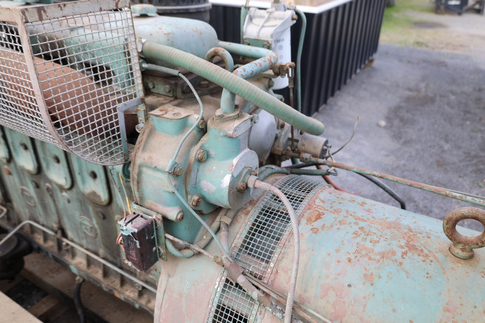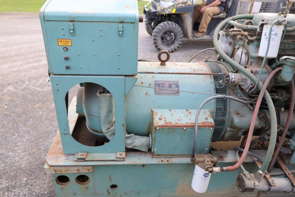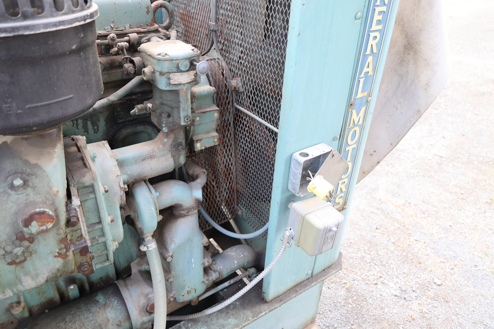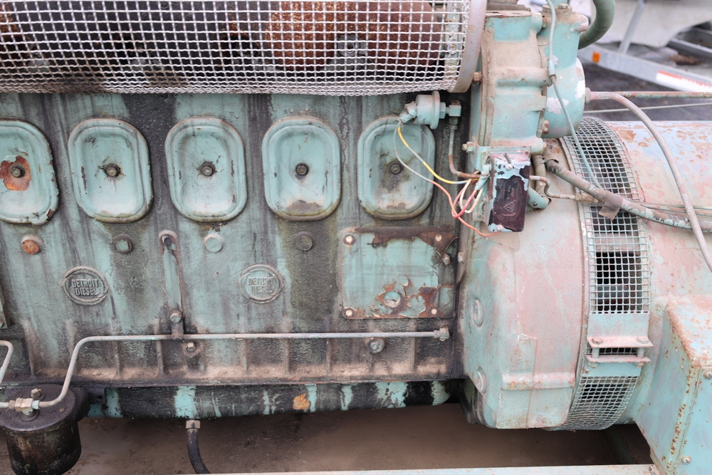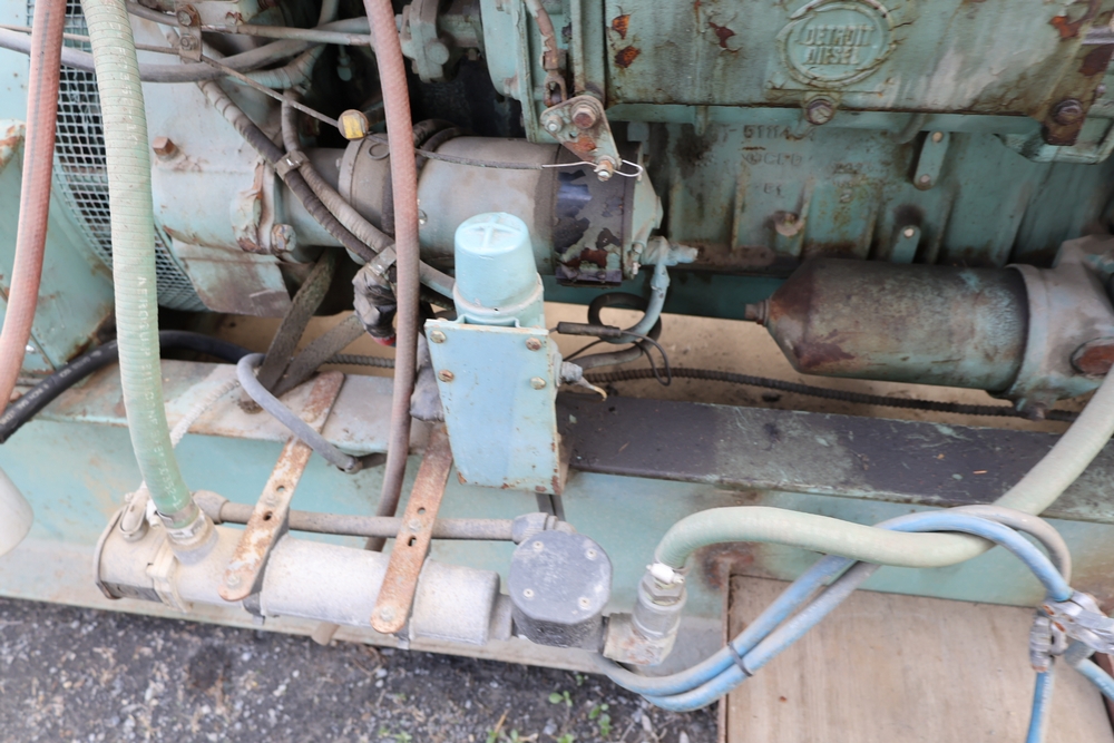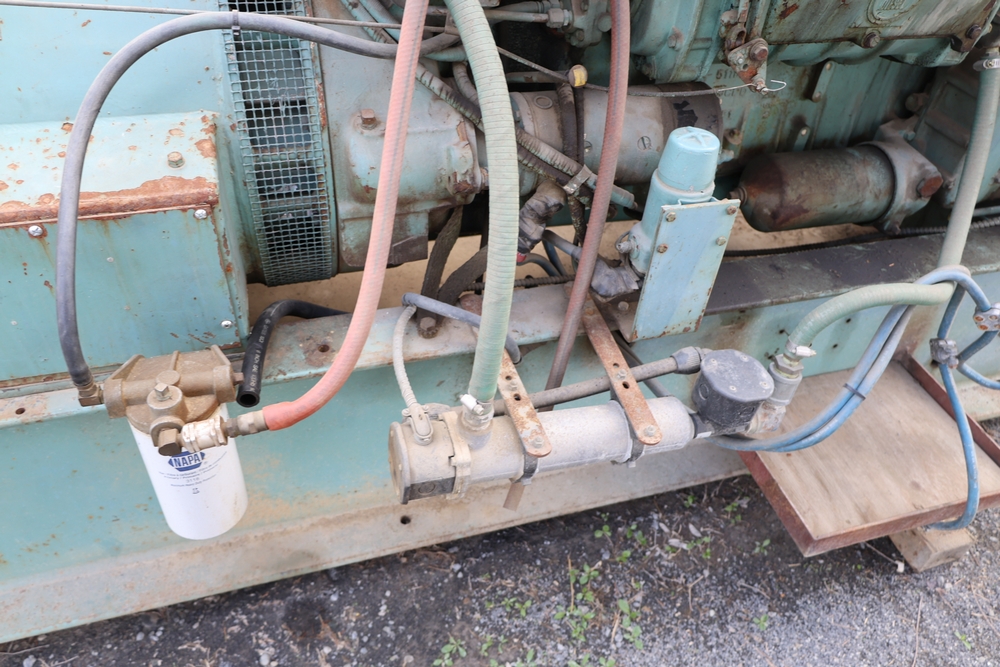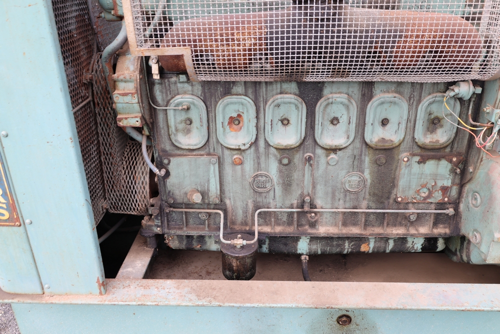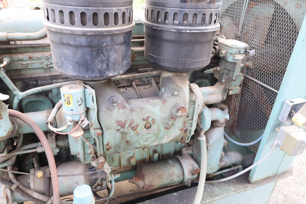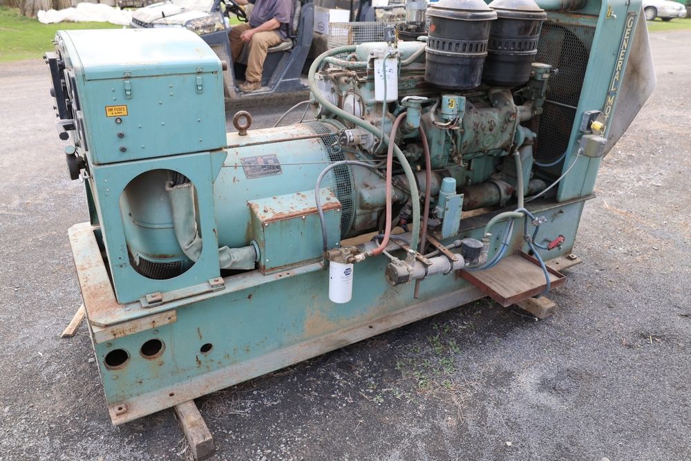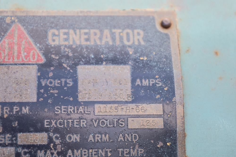 Delco A.C. generator unit with General Motors engine, model 146834, rated 100 kW, 125 kVA, 3 phase, 60 cycles, 1800 RPM, 208-240/116-480 volt output, skid mounted with control panel, gauges, switches, muffler, dual air cleaners, and attached wiring.