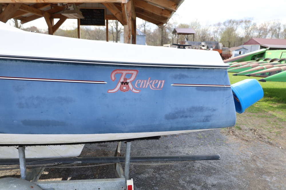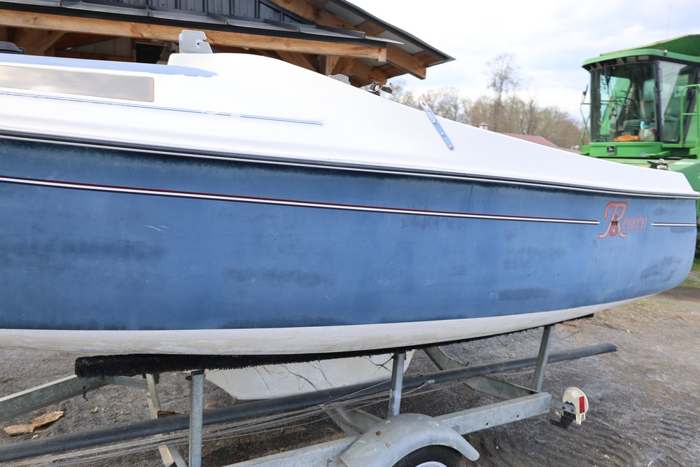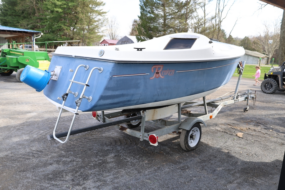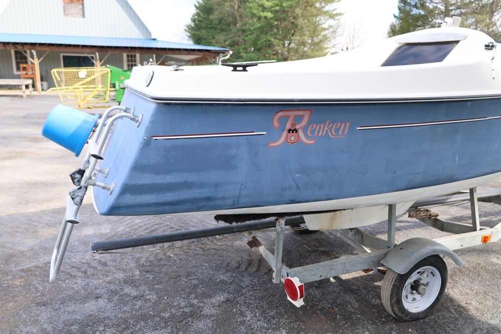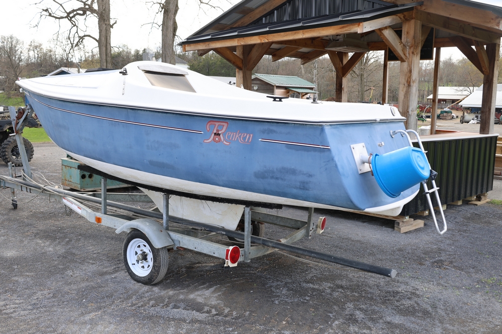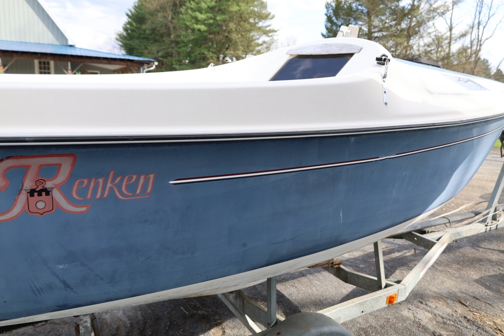 Renken fiberglass sailboat with enclosed cabin, mounted on single axle trailer, blue hull with white deck, cockpit area with hatch and window, rear swim ladder, transom mount plate, and trailer jack. No paperwork.