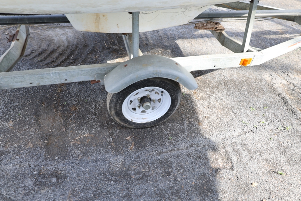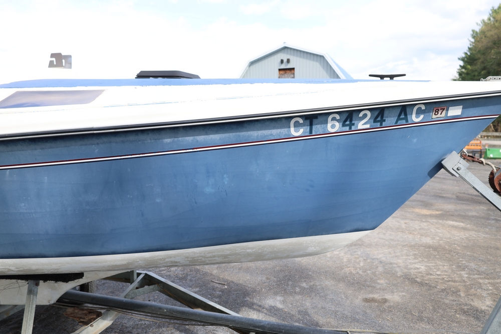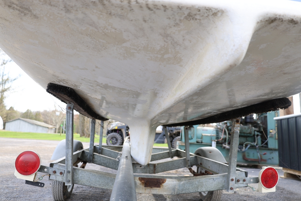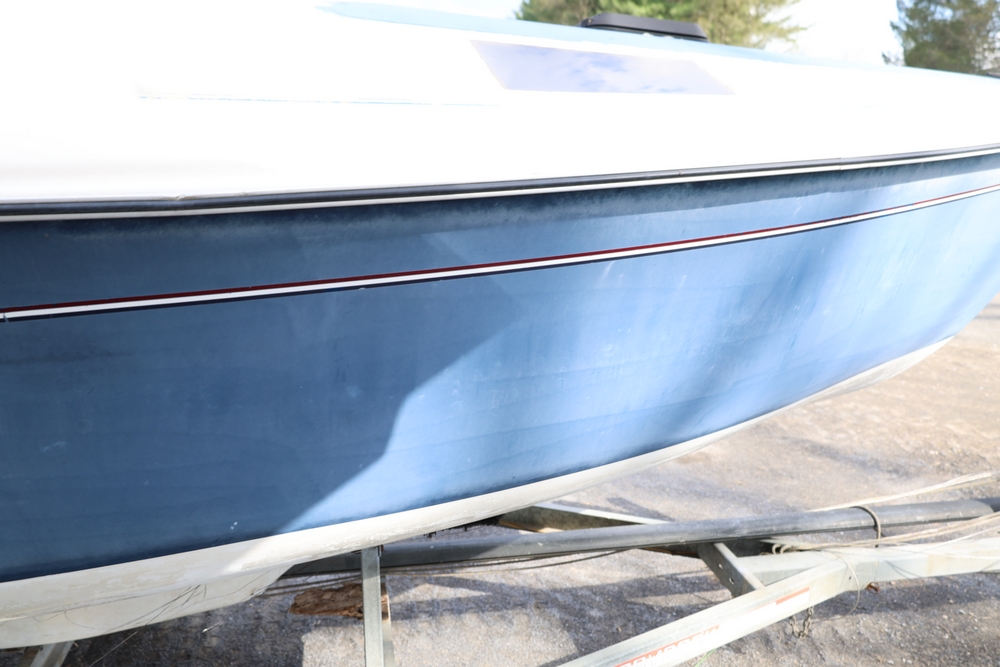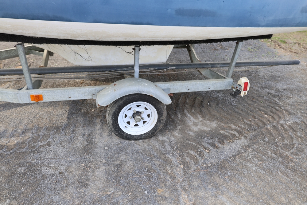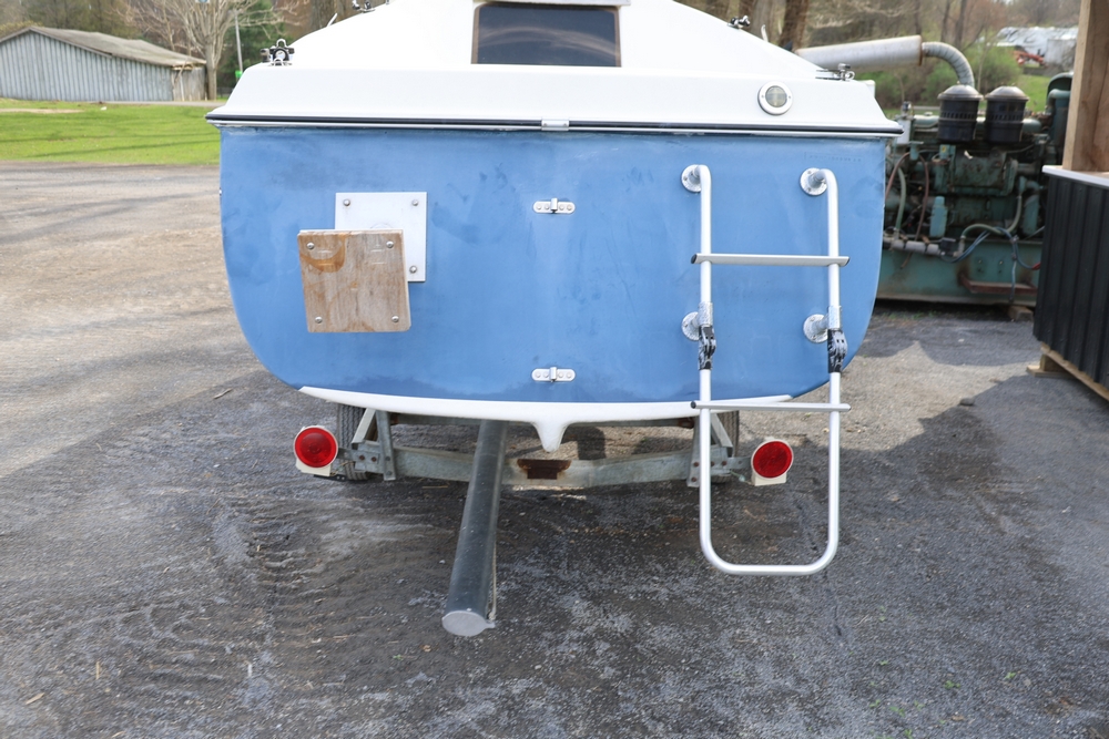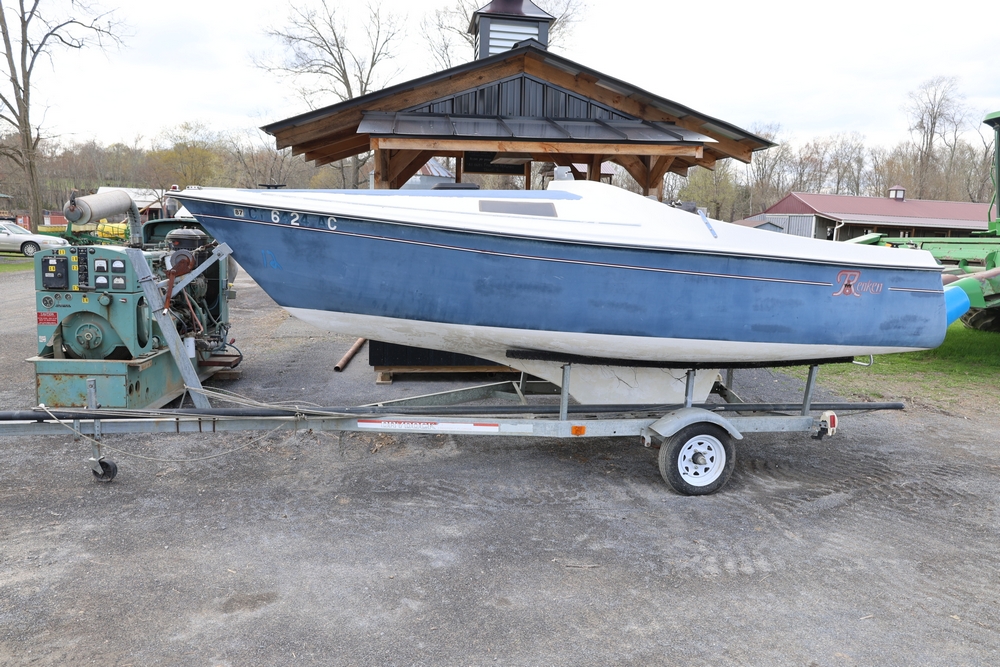 Renken fiberglass sailboat with enclosed cabin, mounted on single axle trailer, blue hull with white deck, cockpit area with hatch and window, rear swim ladder, transom mount plate, and trailer jack. No paperwork.