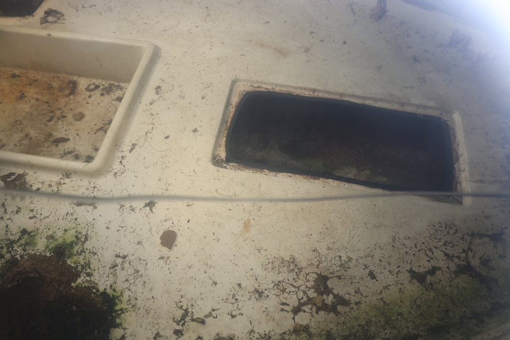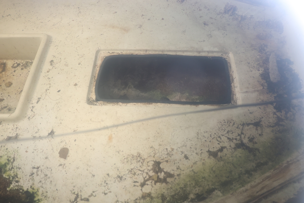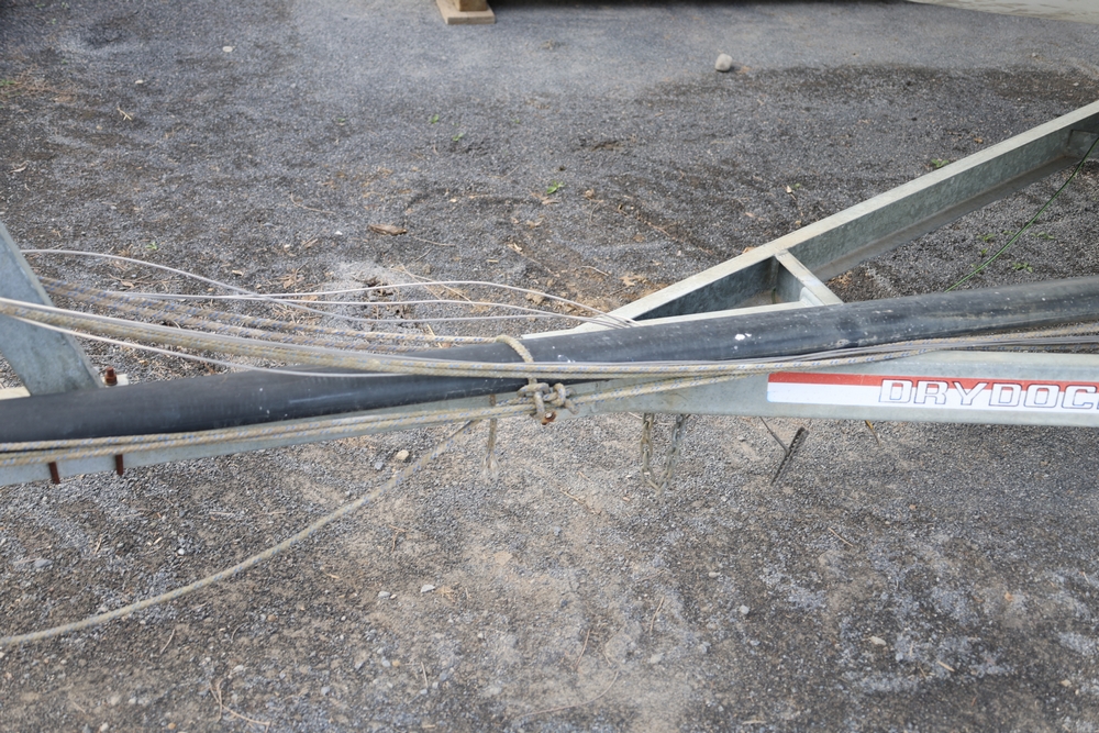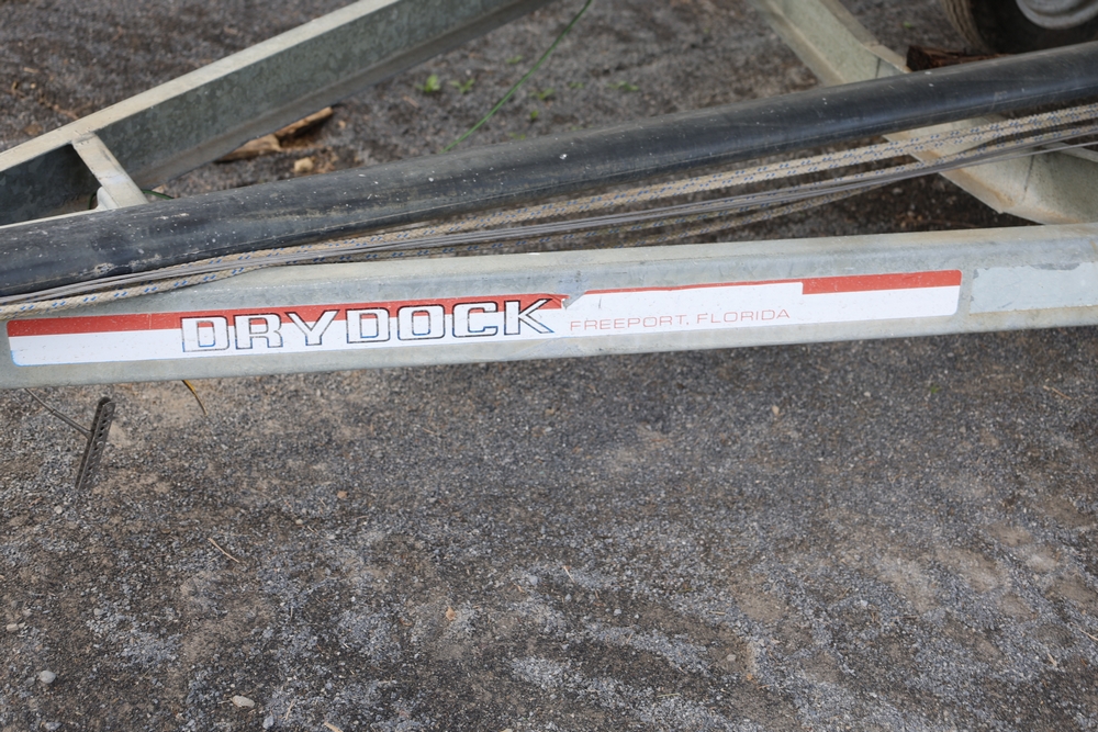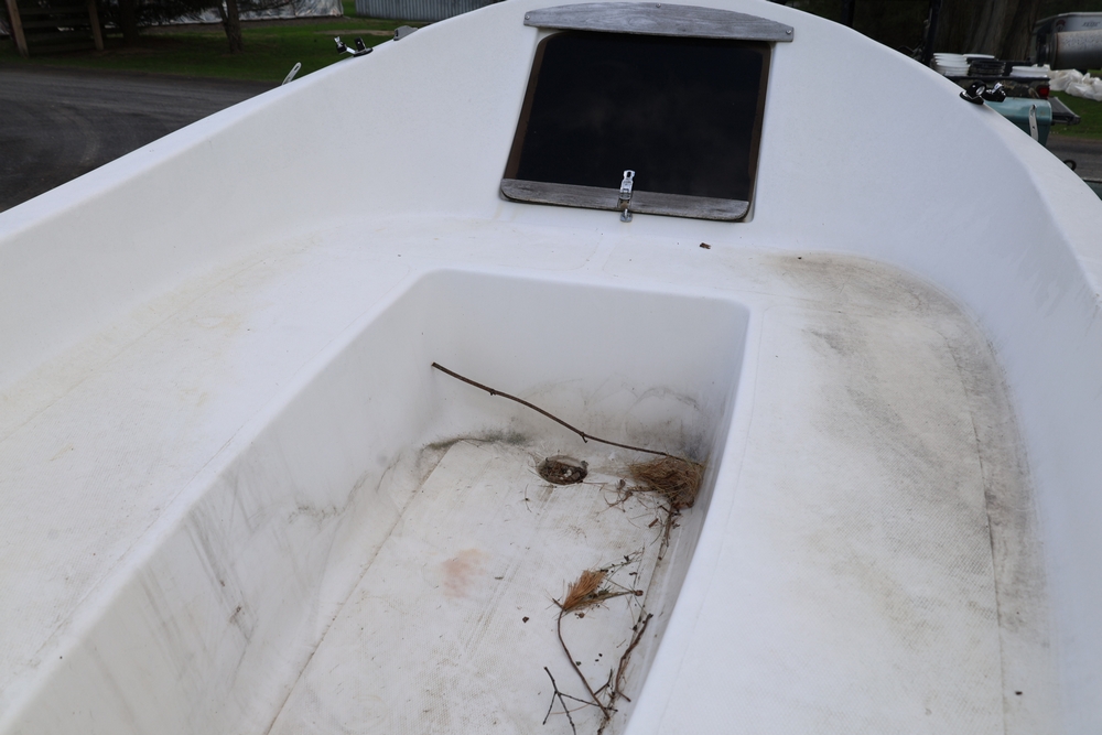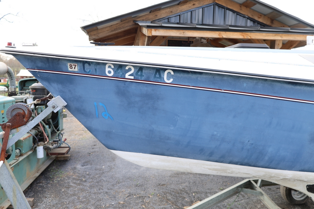Renken fiberglass sailboat with enclosed cabin, mounted on single axle trailer, blue hull with white deck, cockpit area with hatch and window, rear swim ladder, transom mount plate, and trailer jack. No paperwork.