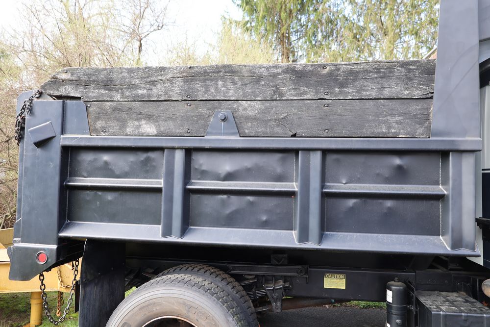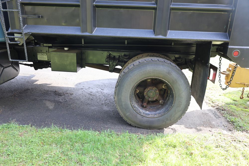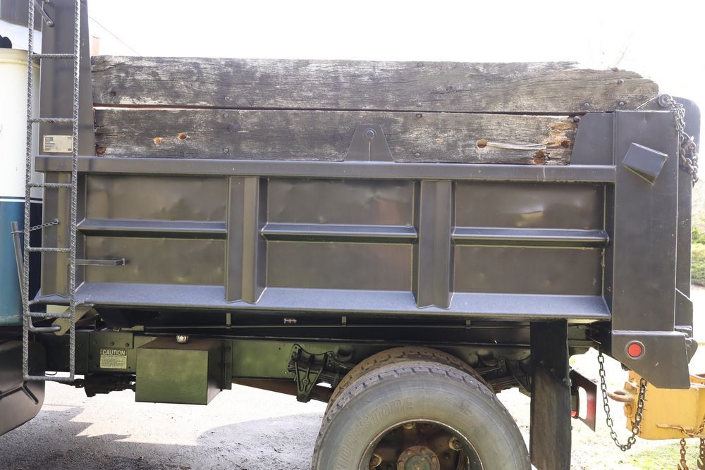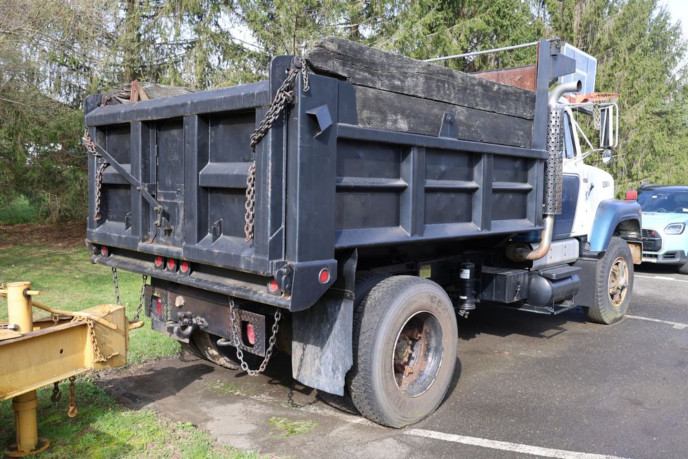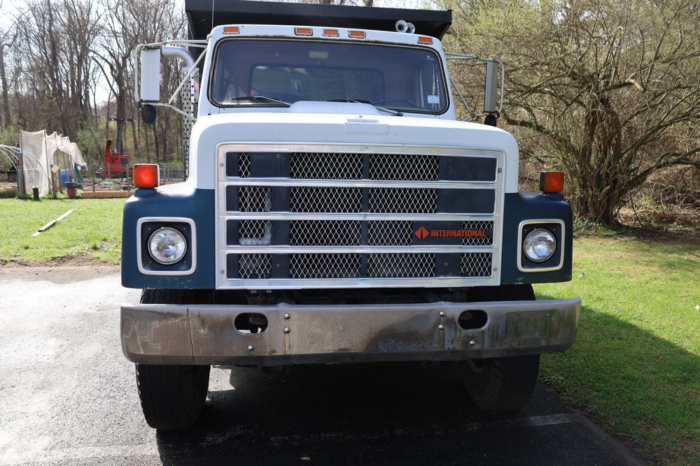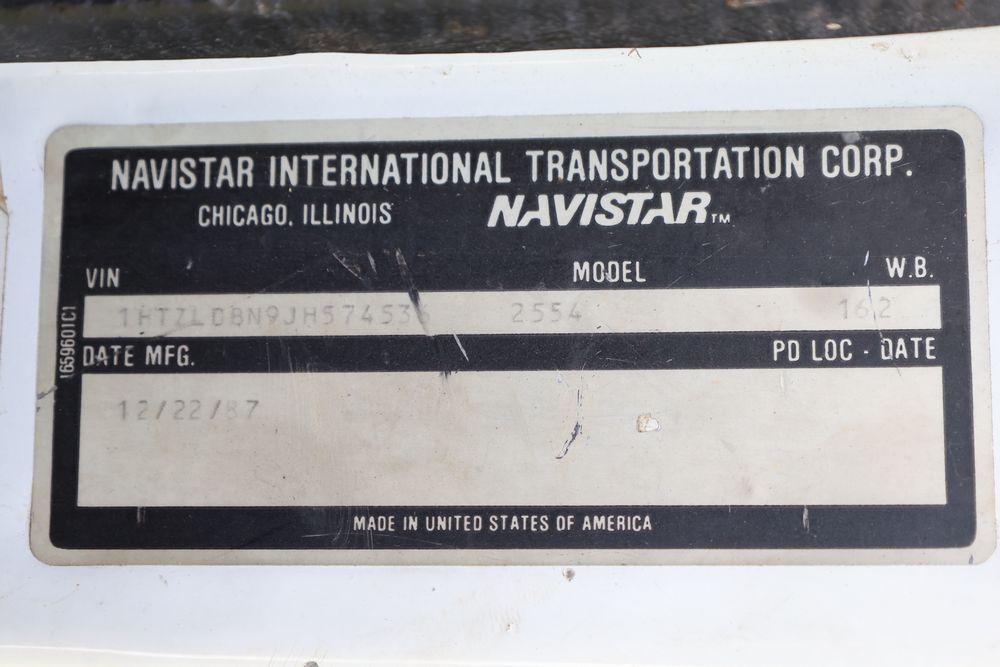 1988 International 554 with a 7.6L L6 diesel engine. VIN: 1HTZLDBN9JH574536. Odometer reading: 26333. Body: conventional cab. Dump body with wood side boards; rear tailgate with chains; dual rear wheels; manual transmission with floor shifter; exterior mirrors; front bumper; hour meter reading 1762. Runs, drives, and operates. Title and key available.