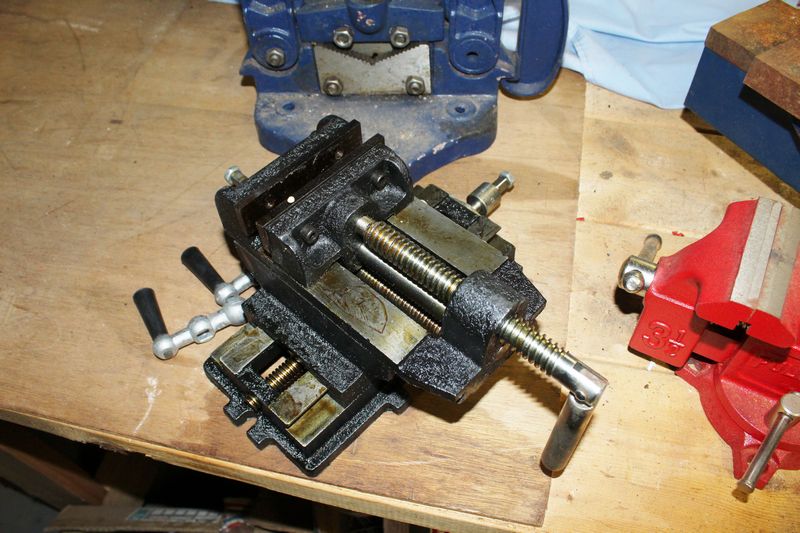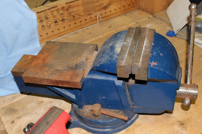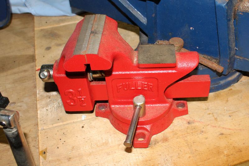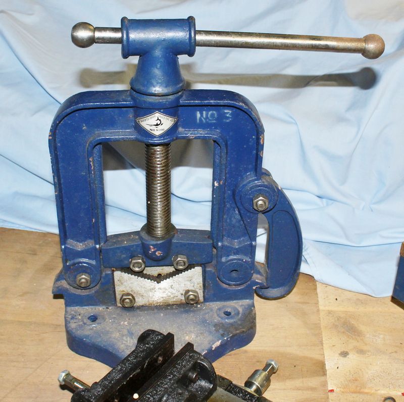 Four shop vices including a large/heavy steel bench vise 9”Tx19”L; a Fuller 3 1/2” bench vise; Cal-Hawk 4” flat siding vise in new condition; Swordfish brand No. 3 Hinged Pipe Vice.