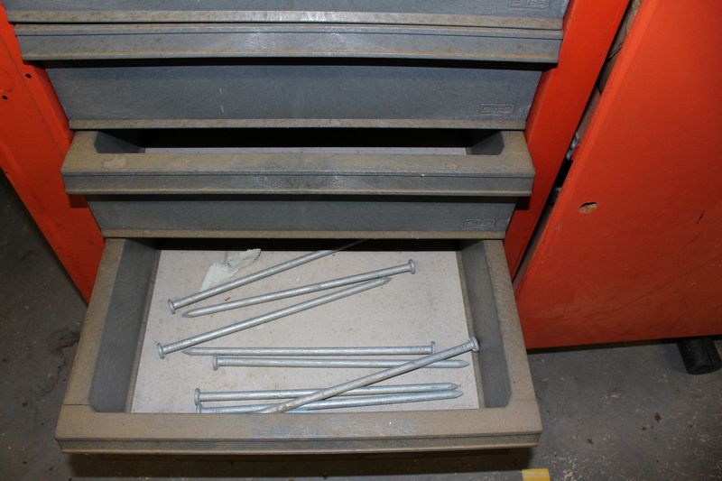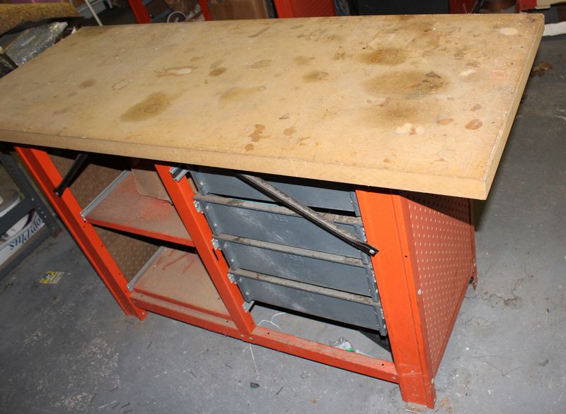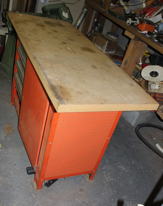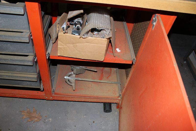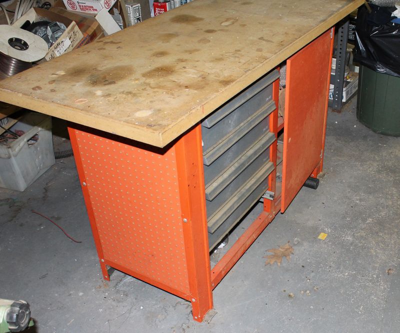 Shop bench 35”Tx60”Wx24”W with contents. Items appearing in backgrounds of photos are not included. Large, heavy item. Buyer must bring assistance to remove via garage door and graveled area to driveway.