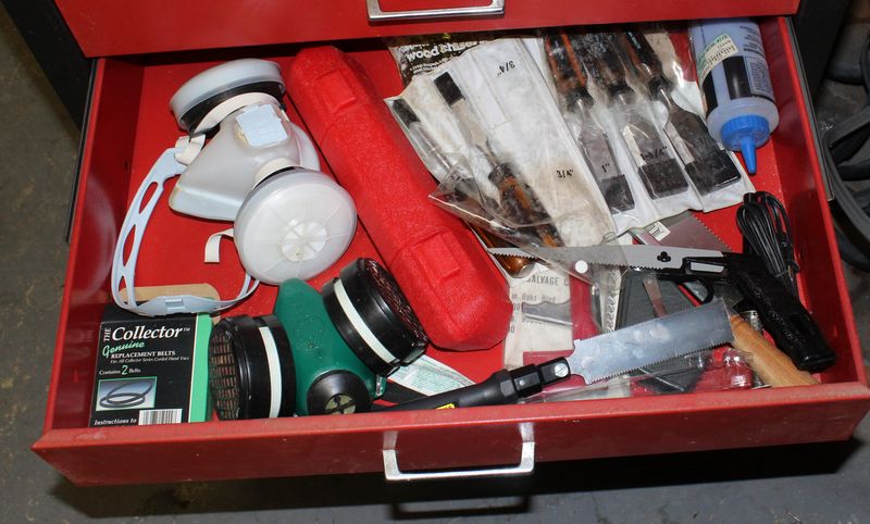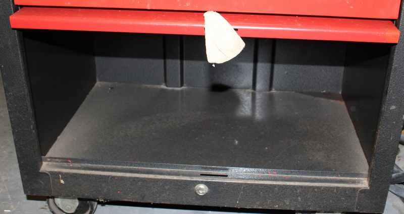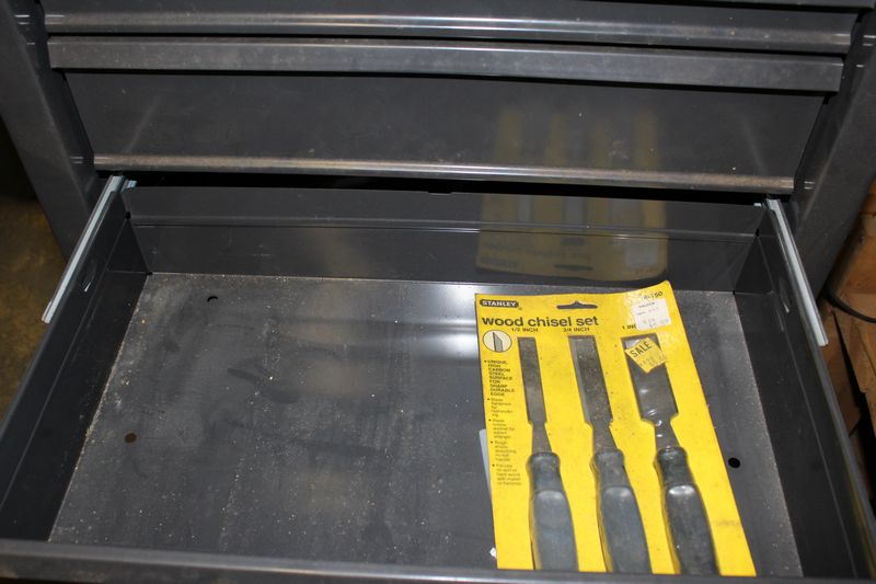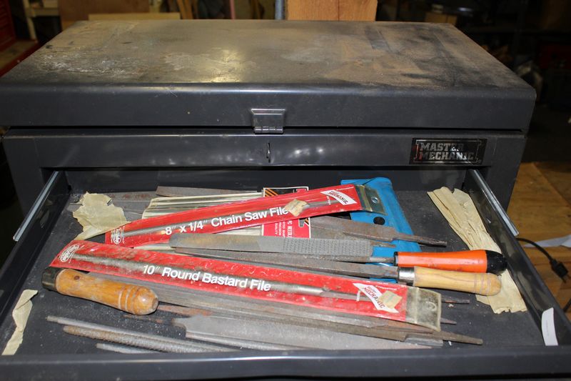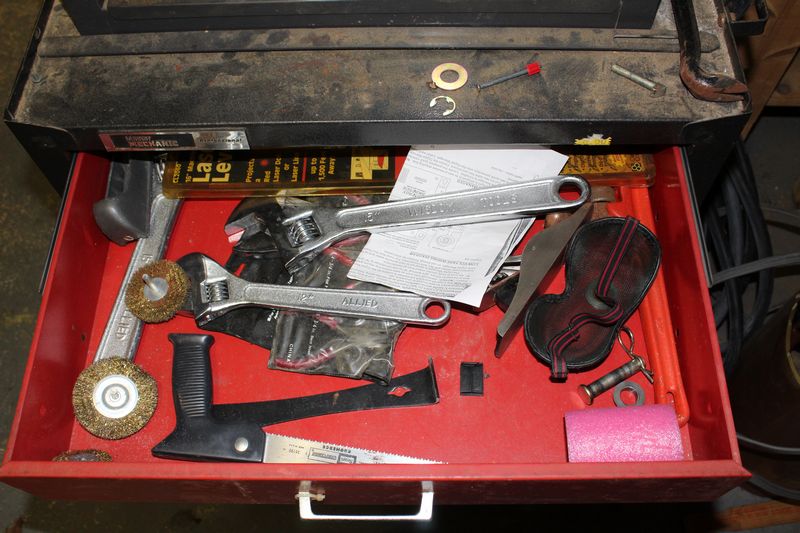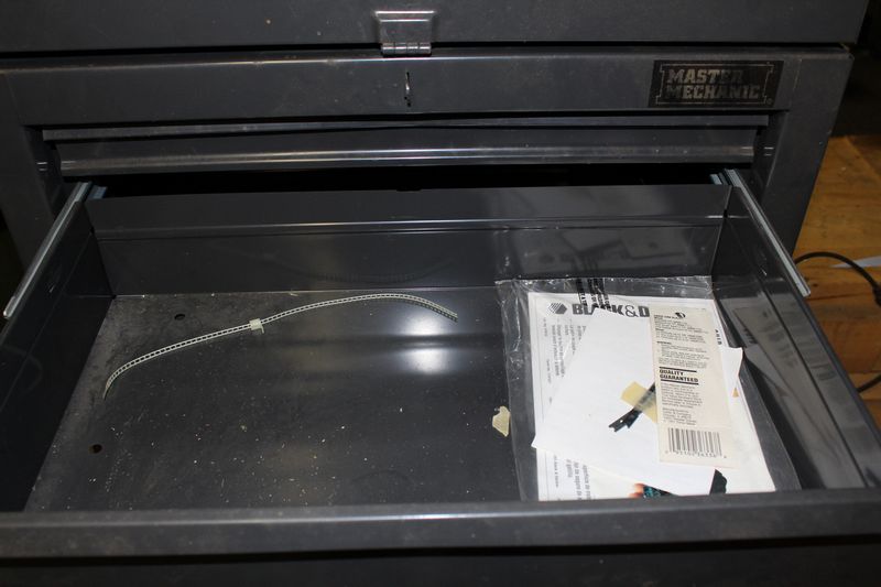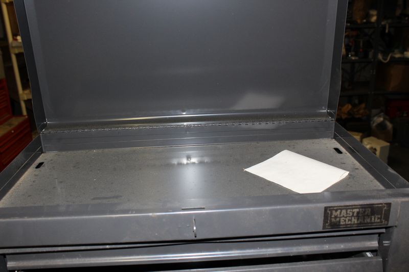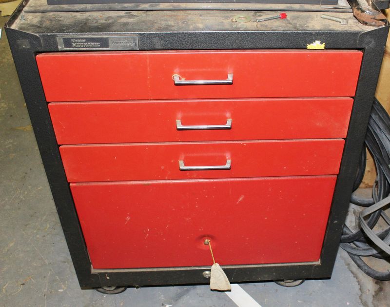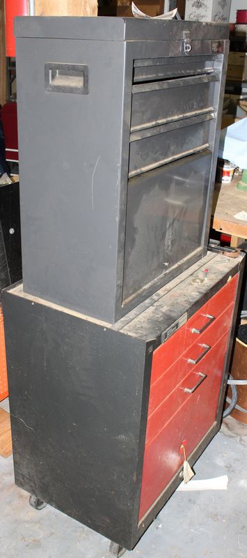 Two part Master Mechanic rolling tool box with contents. Base is 33.5”Tx26.5'Wx18”D; Top is 28”Tx22”Wx12”D. Items appearing in backgrounds of photos are not included. Buyer must bring assistance to remove via garage door and graveled area to driveway.