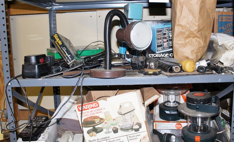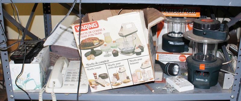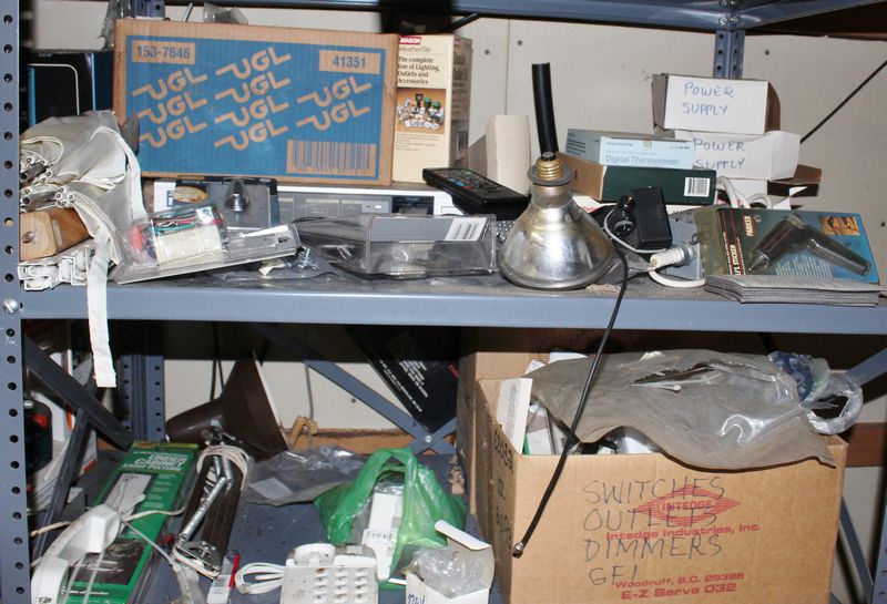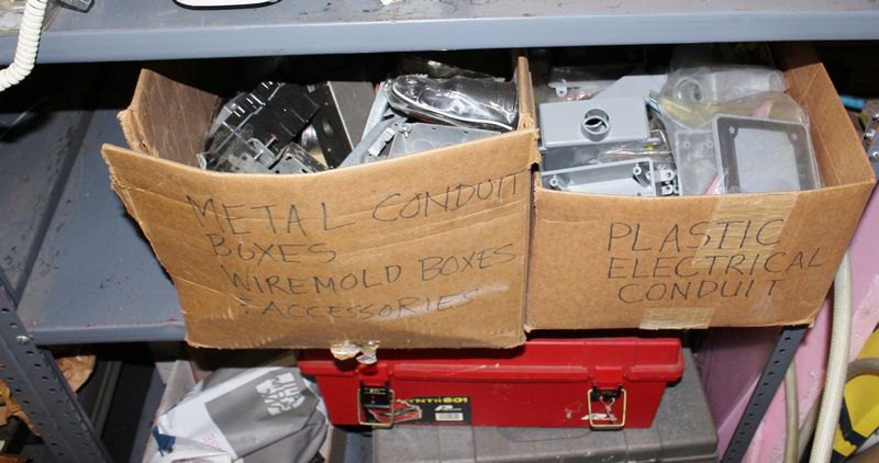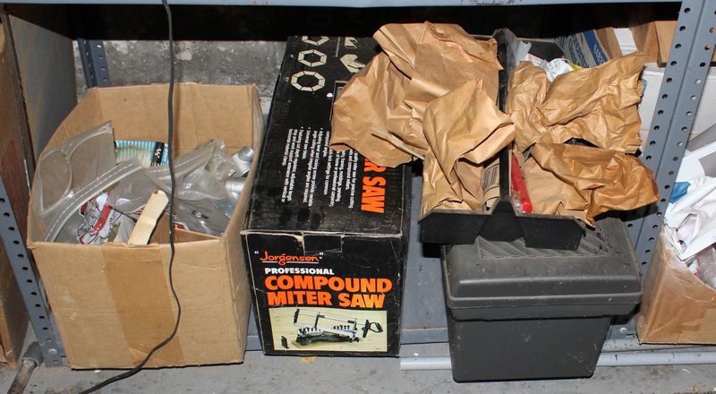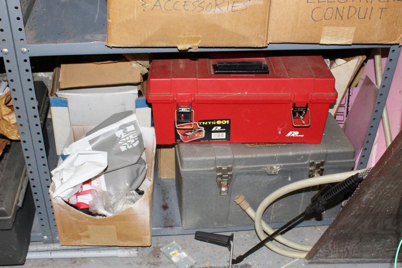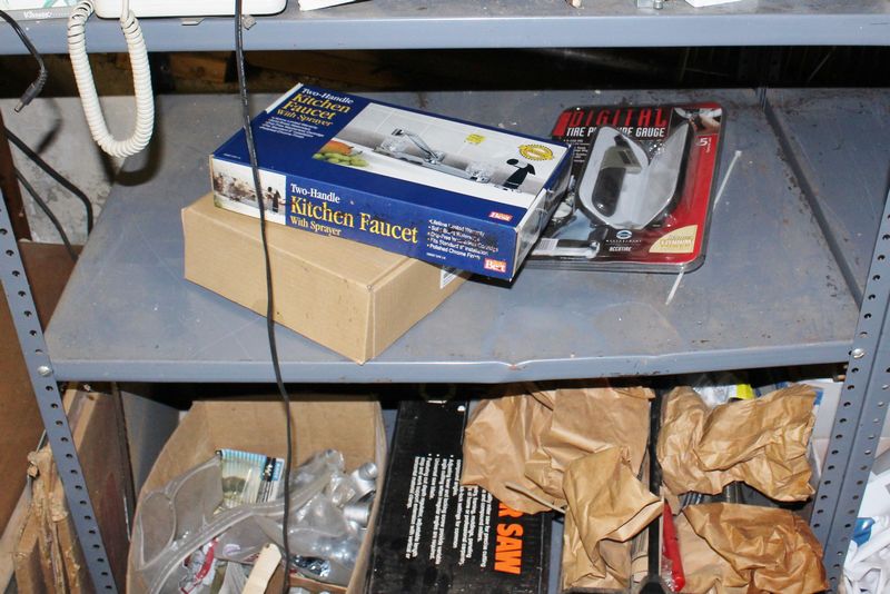 Two steel shelving units with contents being auctioned buyer choice. Winning bidder may take what they want and leave the rest. Each shelving unit is 70”Tx36”Wx24”D. Contents include tools; plumbing supplies; electrical supplies; etc.