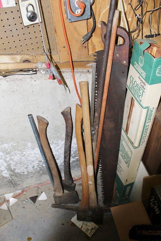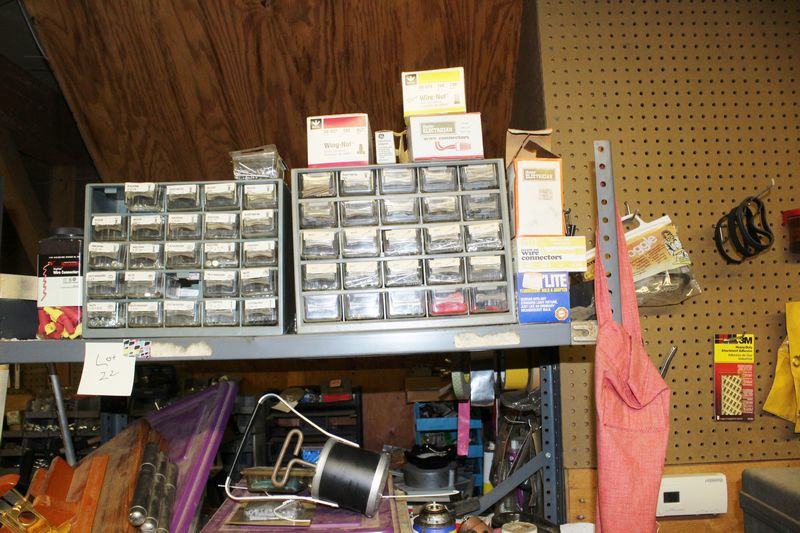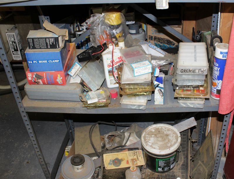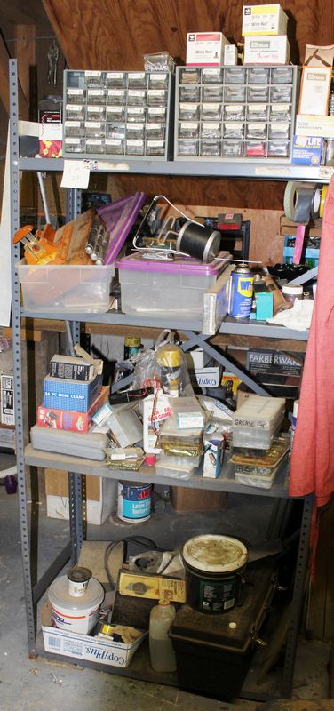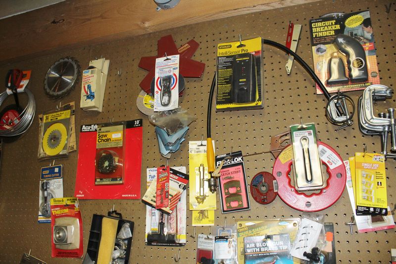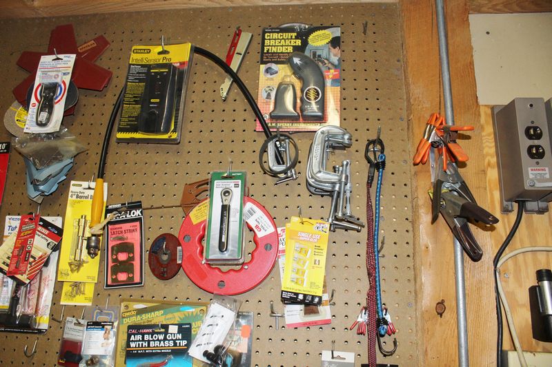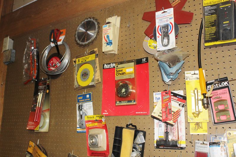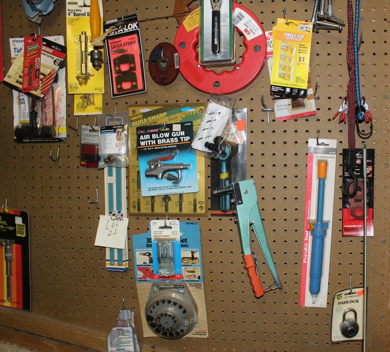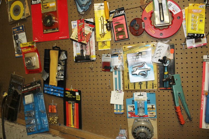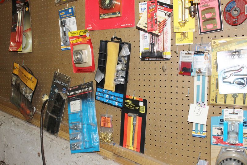 Misc. tools and hardware on wall and metal shelves being auctioned buyer choice. Winning bidder may take what they want and leave the rest. Shelving unit is included.