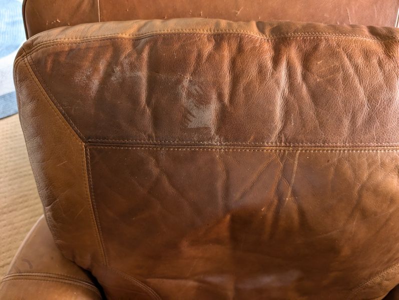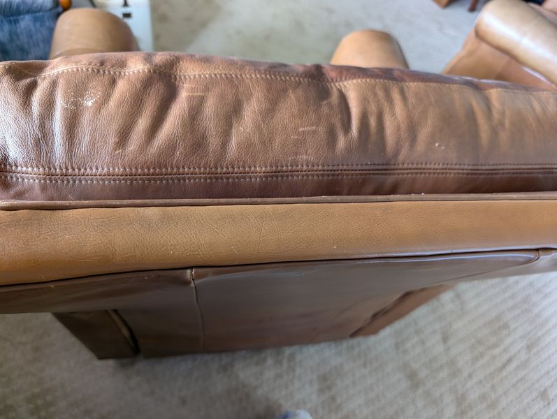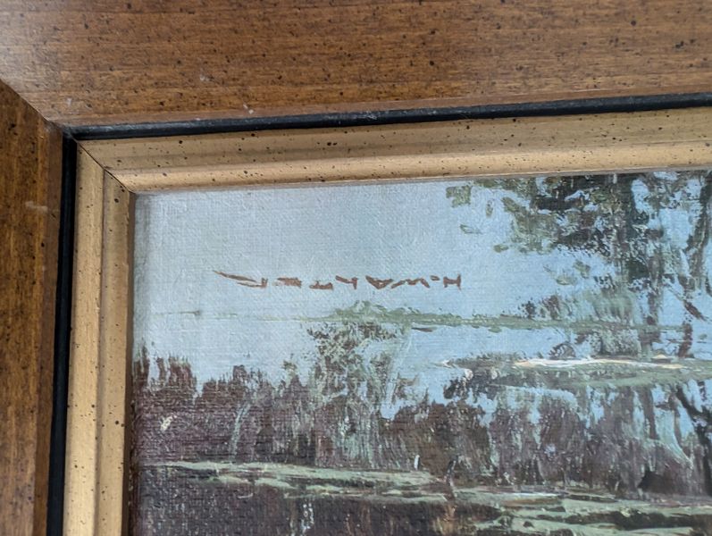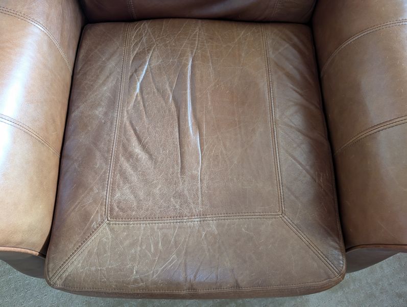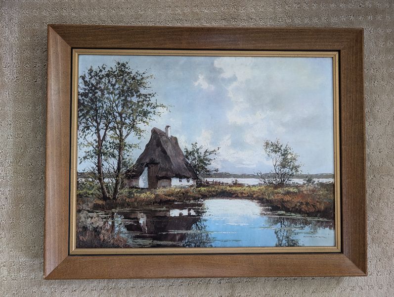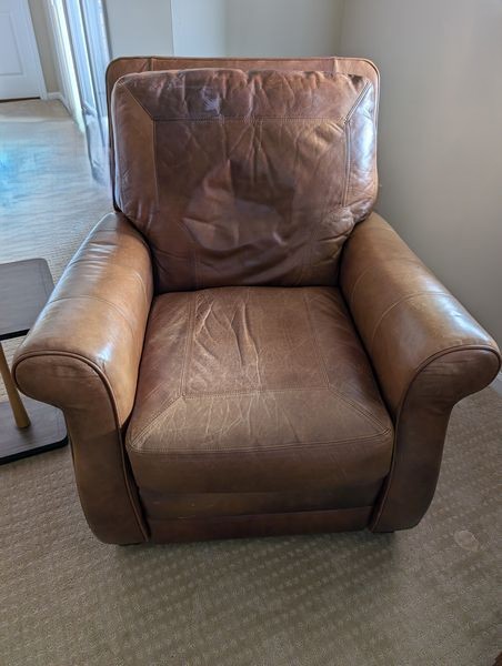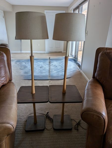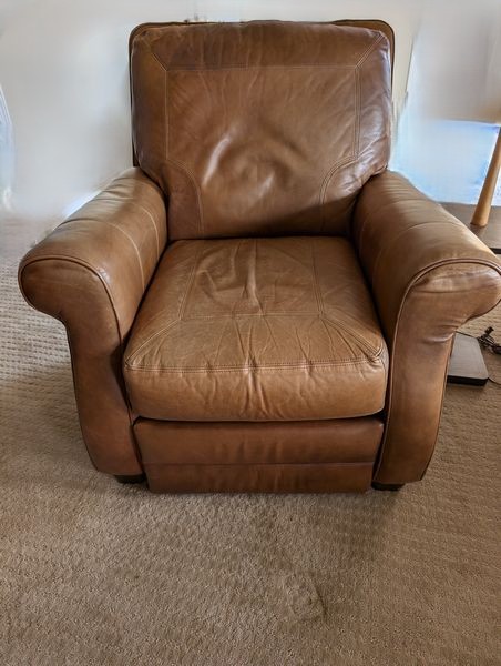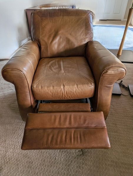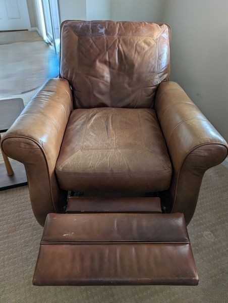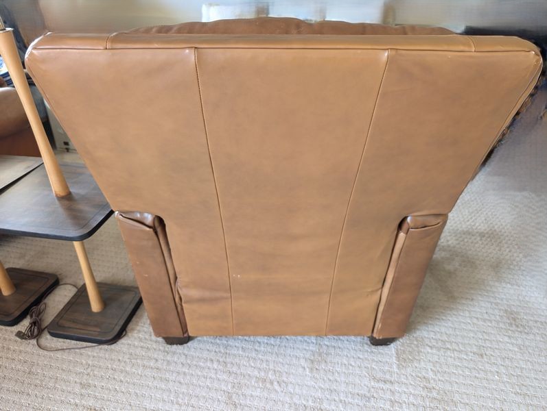 Leather Recliners, Lamp Tables, Art. Pair of brown leather recliners, ea. 3'Wx2'Dx39"H & opens to 50" (see photos for condition); pr vintage Mid-Century Modern lamp tables, ea. 15"x54"H; signed wood-framed vintage print. Loc in lower level with walk out.