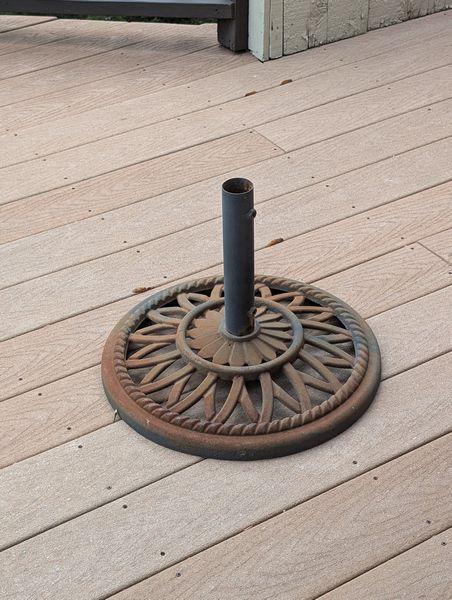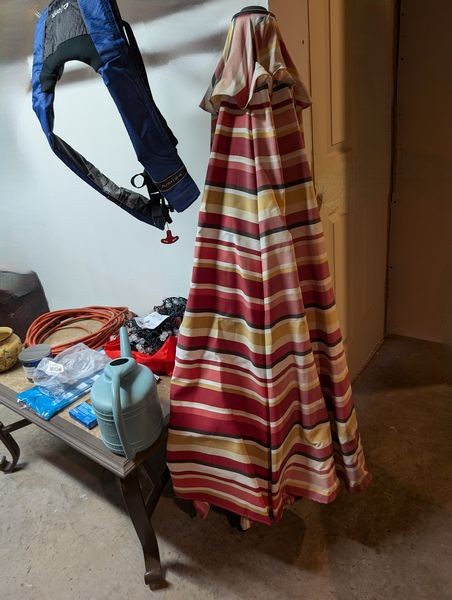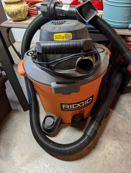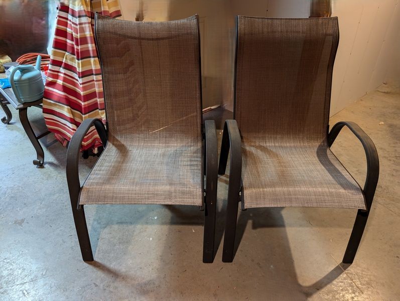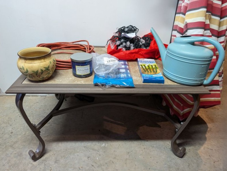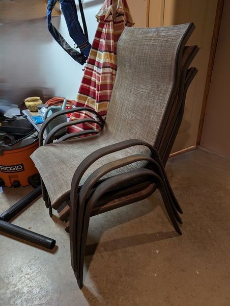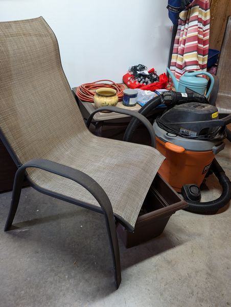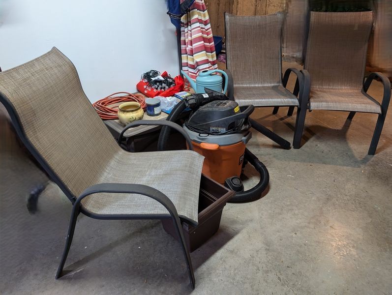 Outdoor Furniture. set of 3 alum stacking armchairs by Summer Winds, ea. 25"Wx18"Dx39"H; coordinating coffee table, 35"Wx25"Dx18"H; patio umbrella & stand; Rigid shop vac; other related items as seen in photos. Loc in unfinished basement near walk out. Umbrella stand opt and loc on deck.